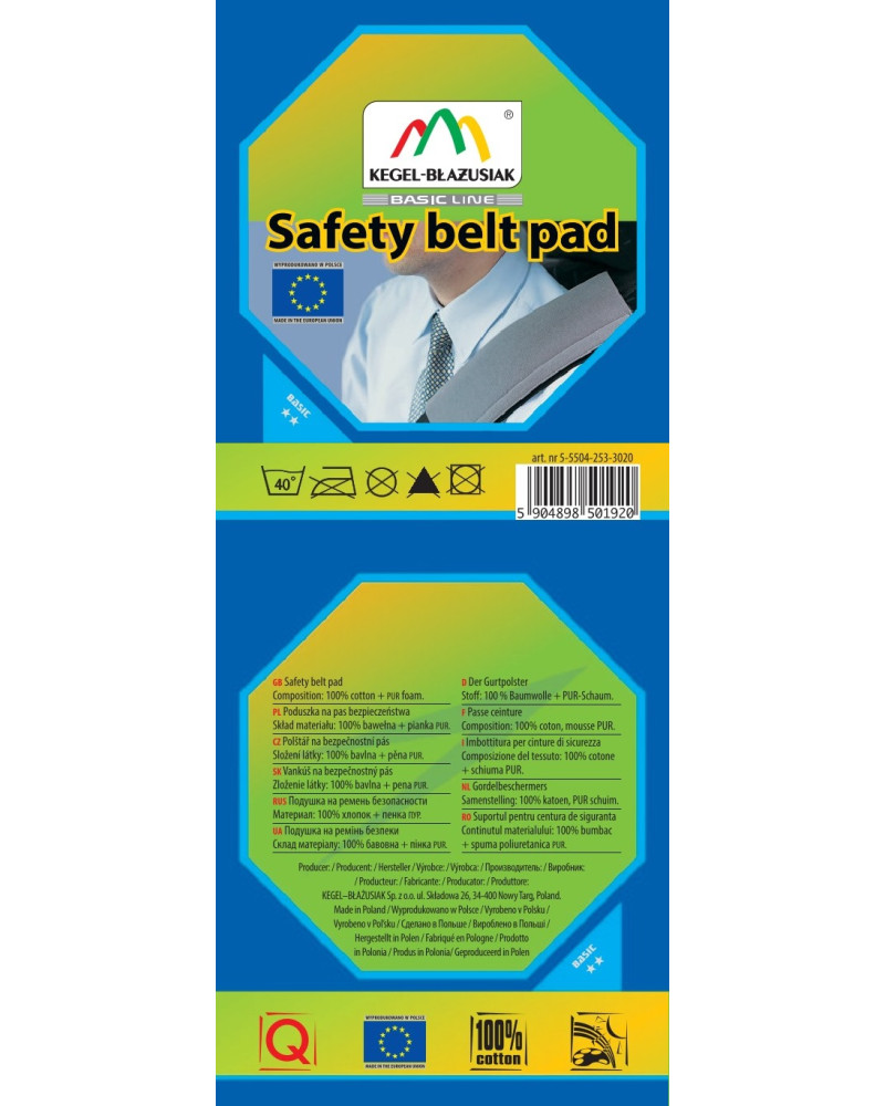 Grâce à son matériau agréable et doux pour la peau et à son rembourrage en mousse PUR souple, le coussin est très confortable - il aidera à soutenir une tête fatiguée et facilitera le sommeil. Vos enfants seront ravis. Le coussin est fabriqué en coton dans une variété de couleurs (bleu, rouge, vert, gris et jaune). Les couleurs sont profondes et intenses, sans être criardes, mais plutôt discrètes. SAFETY BELT PAD est un accessoire sympa et bon marché qui enrichit l'intérieur de la voiture. Le produit est très facile à nettoyer - il peut être lavé à 40° sans problème.