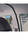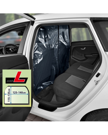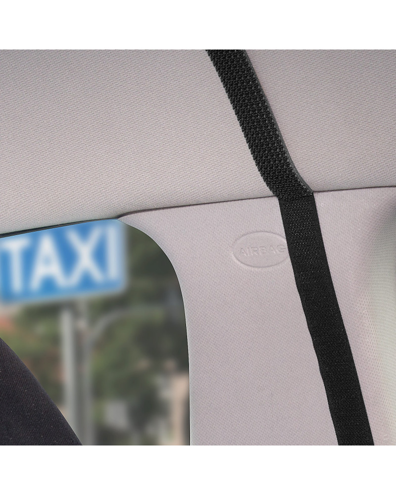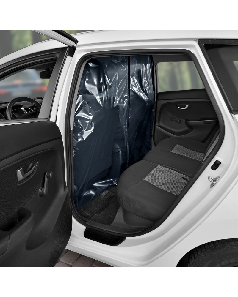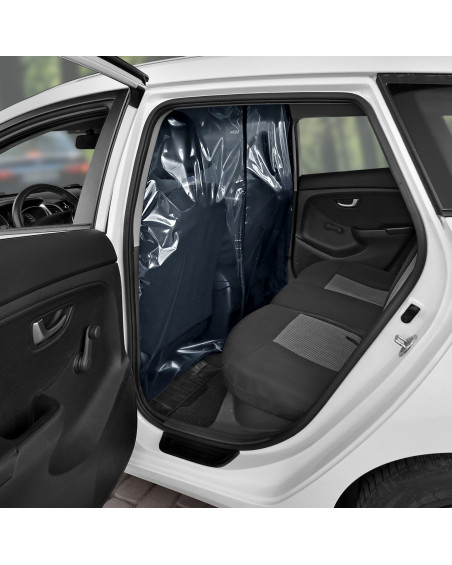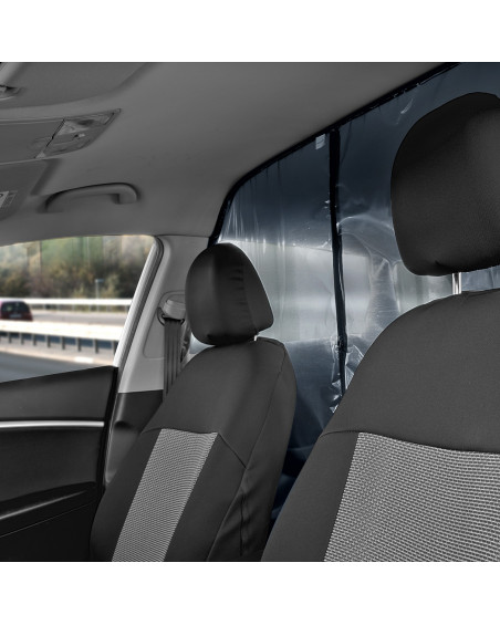 Le rideau transparent qui sépare l'espace conducteur (deux sièges avant) de l'espace passager (banquette arrière). Avec un orifice ouvrable et réglable du côté conducteur qui rend possible l'acceptation du paiement. Il est possible d'accepter les paiements par carte sans contact à travers le rideau, sans avoir à l'ouvrir. Avec un montage correct, le rideau crée une paroi d'une haute étanchéité dans la voiture. Le rideau peut être désinfecté avec des liquides désinfectants généralement disponibles et nettoyé avec des produits d'entretien généralement disponibles. Le montage simple, sans avoir à utiliser des outils, grâce à un ruban scratch auto adhésif industriel et ruban scratch auto adhésif, résistant de type Velcro.