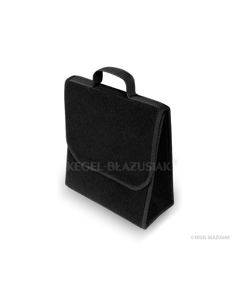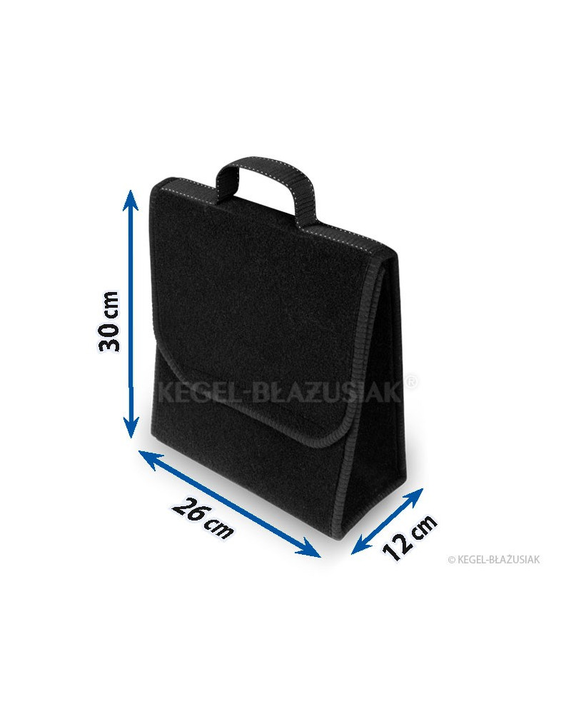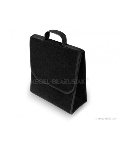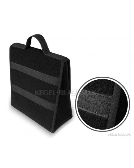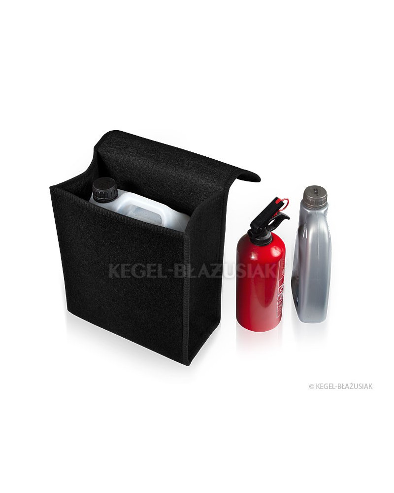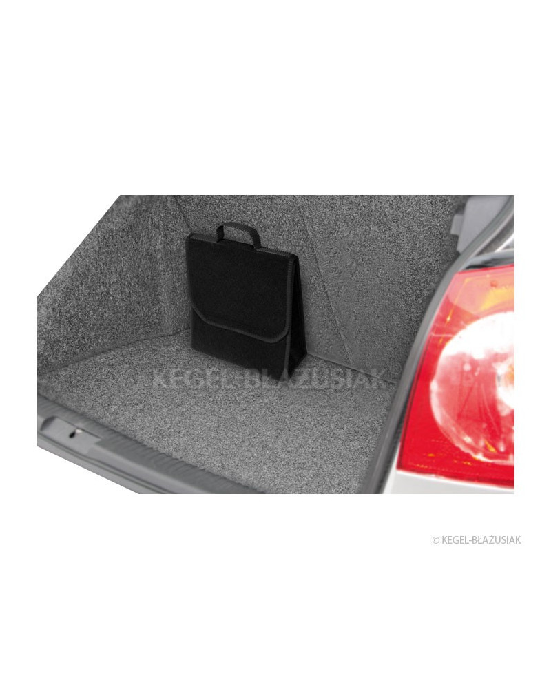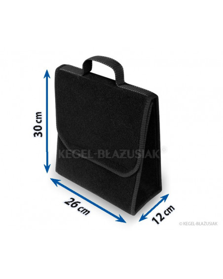 Exceptionnellement pratique, ce sac pour le coffre, fait d'un matériau de tapis, est muni de très solides velcros en-dessous et sur la paroi arrière, permettra de ranger dans le coffre de nombreuses affaires, même lourdes ou aigües. Il vous aidera à garder de l'ordre à l'intérieur de la voiture, protègera vos affaires, mais aussi le coffre des endommagements. Sa forme verticale s'avère très commode, permet d'y ranger un bidon d'huile de 5 litres ou de liquide de lavage des vitres, ou bien un extincteur d'un kilo ou d'autres accessoires nécessaires dans la voiture : outillage, ampoules, etc. Grâce à ses velcros solides sur toute la longueur du sac il tient bien au revêtement du coffre. il a une grande capacité, se ferme avec un couvercle réglable à velcros. Ne prend pas beaucoup de place. Une oreille facilite son déplacement. La couleur noire lui apporte de l'élégance.