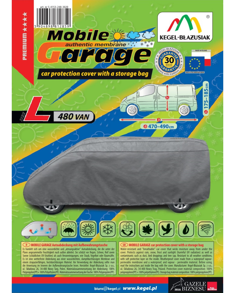 La housse de MOBILE GARAGE de haute qualité est un produit adapté aux besoins des conducteurs. Elle est composée de 4 couches de matériaux épais, solides et durables. La housse protège l'ensemble de la voiture contre les influences néfastes de l'environnement. La housse Mobile Garage est la protection idéale pour votre véhicule tout au long de l'année. Sa fonctionnalité peut être appréciée en toute saison. En hiver, il empêche l'accumulation de neige, de givre et de glace et résiste au gel ; en automne, il protège contre la pluie, le vent, les feuilles, la sève des arbres ; et en été et au printemps, il protège contre les rayons UV, la poussière et les fientes d'oiseaux. Les propriétés particulières du matériau multicouche garantissent que la housse ne se mouille pas, tout en permettant à la vapeur d'eau de s'échapper du dessous de la housse vers l'extérieur. Toute trace d'humidité qui s'accumule sous la bâche s'évapore rapidement, évitant ainsi la rouille de la voiture et la formation de moisissures. La housse convient à une utilisation immédiate ou à long terme. La housse peut être lavée à la main à 40 degrés.