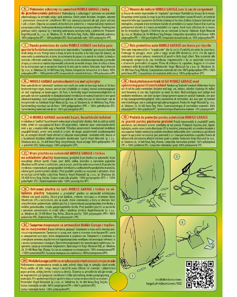 La housse de MOBILE GARAGE de haute qualité est un produit adapté aux besoins des conducteurs. Elle est composée de 4 couches de matériaux épais, solides et durables. La housse protège l'ensemble de la voiture contre les influences néfastes de l'environnement. La housse Mobile Garage est la protection idéale pour votre véhicule tout au long de l'année. Sa fonctionnalité peut être appréciée en toute saison. En hiver, il empêche l'accumulation de neige, de givre et de glace et résiste au gel ; en automne, il protège contre la pluie, le vent, les feuilles, la sève des arbres ; et en été et au printemps, il protège contre les rayons UV, la poussière et les fientes d'oiseaux. Les propriétés particulières du matériau multicouche garantissent que la housse ne se mouille pas, tout en permettant à la vapeur d'eau de s'échapper du dessous de la housse vers l'extérieur. Toute trace d'humidité qui s'accumule sous la bâche s'évapore rapidement, évitant ainsi la rouille de la voiture et la formation de moisissures. La housse convient à une utilisation immédiate ou à long terme. La housse peut être lavée à la main à 40 degrés.