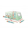 Mettre la housse sur une caravane propre et sèche, avec le côté blanc de la housse vers l'intérieur (l'imprimé à l'extérieur). Pour enfiler la housse sans utiliser une échelle, deux personnes sont nécessaires, équipées de deux perches solides (perches non comprises), de la longueur d'environ 1,5 mètre ou plus, en fonction de la hauteur de la caravane. Commencer par étendre une grande feuille de tissu ou de film propre derrière la caravane, pour protéger la housse contre les saletés. Placer la housse sur la feuille derrière la caravane, en la plaçant dans le même sens que la caravane. Afin de faciliter la pose correcte de la housse, l'étiquette FRONT est cousue à l'avant de la housse et l'étiquette REAR à l'arrière de la housse (les marquages correspondent à l'avant et à l'arrière de la caravane). Les fixations sous forme de poches sont cousues aux coins avant inférieurs de la housse, dans lesquelles les perches doivent être insérées. À l'aide des perches insérées dans les porte-poches, deux personnes doivent soulever la housse au-dessus de l'arrière de la caravane, puis la tirer par-dessus le toit de la caravane en avançant le long de la caravane (une personne sur le côté gauche, l'autre sur le côté droit de la caravane), pour terminer à l'avant de la caravane, et en effet en faisant glisser la housse sur toute la caravane. Ensuite, serrer et nouer le cordon d'un bord-côtes inférieur de la housse, en prenant soin de croiser les cordons du bord-côtes et former le premier nœud avant de les serrer, et puis serrer fermement les cordons, en dirigeant les forces parallèlement au bord avant de la caravane. Nouer les cordons du bord-côtes et vérifier si le nœud ne se desserre pas après avoir tiré sur le bord- côtes. Si le nœud se desserre, répéter l'action en modifiant la façon de nouer les cordons. Le bord inférieur de la housse est muni de bandes de fixation cousues, qui doivent toutes être enfilées sous la caravane par les trous de la structure portant de la caravane, les plus proches de chaque bande, puis les bandes doivent être bouclées et serrées. La housse est équipée d'un rabat à l’endroit de la porte de la caravane. Pour ouvrir le rabat, faire coulisser les fermetures éclair latérales et décrocher la fermeture velcro située sur le bord inférieur du rabat.
