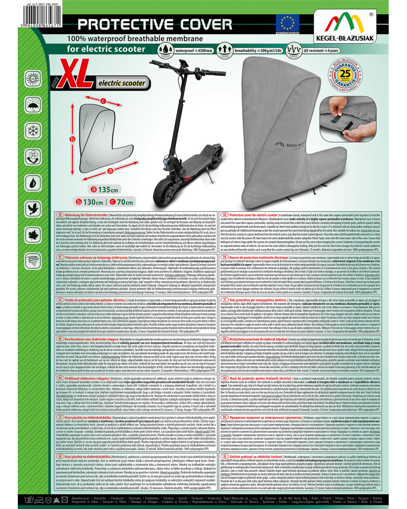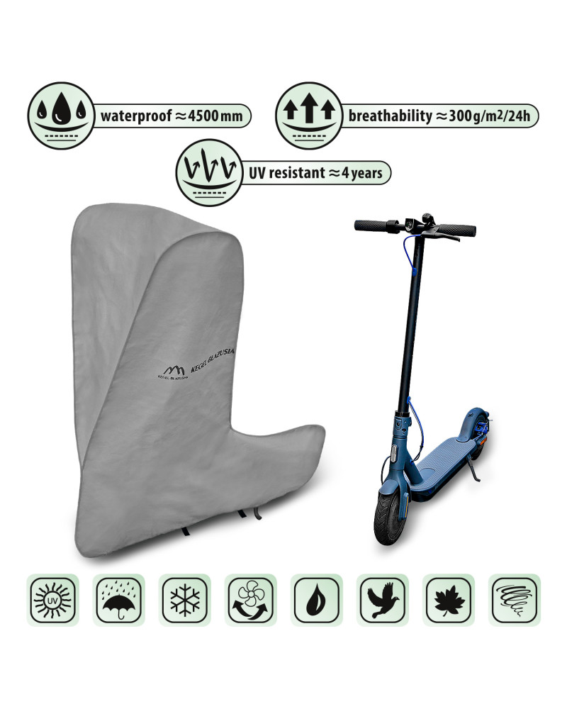 La housse de protection avec membrane, imperméable mais en même temps perméable à la vapeur, pour protéger la trottinette électrique contre les impacts négatifs de l'environnement. La housse résistante aux intempéries, entièrement composée d'une membrane à très haute perméabilité à la vapeur. Imperméable même en cas de forte pluie et en même temps perméable à la vapeur, évacuant l'humidité du dessous de la housse vers l'extérieur. La housse réduit la corrosion et le vieillissement des éléments en plastique, elle protège contre la décoloration et le ternissement du vernis et des pièces chromées. Elle convient parfaitement pour le stockage occasionnel de la trottinette électrique à l’extérieur. Elle est fixée à l'aide d'un tendeur élastique, ce qui permet de l'enfiler et de l'enlever facilement. Des fixations supplémentaires sous la trottinette empêchent que la housse ne soit enlevée par le vent. La housse convient également pour être utilisée à l’intérieur.