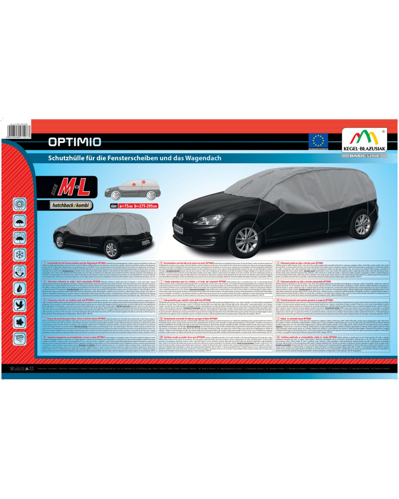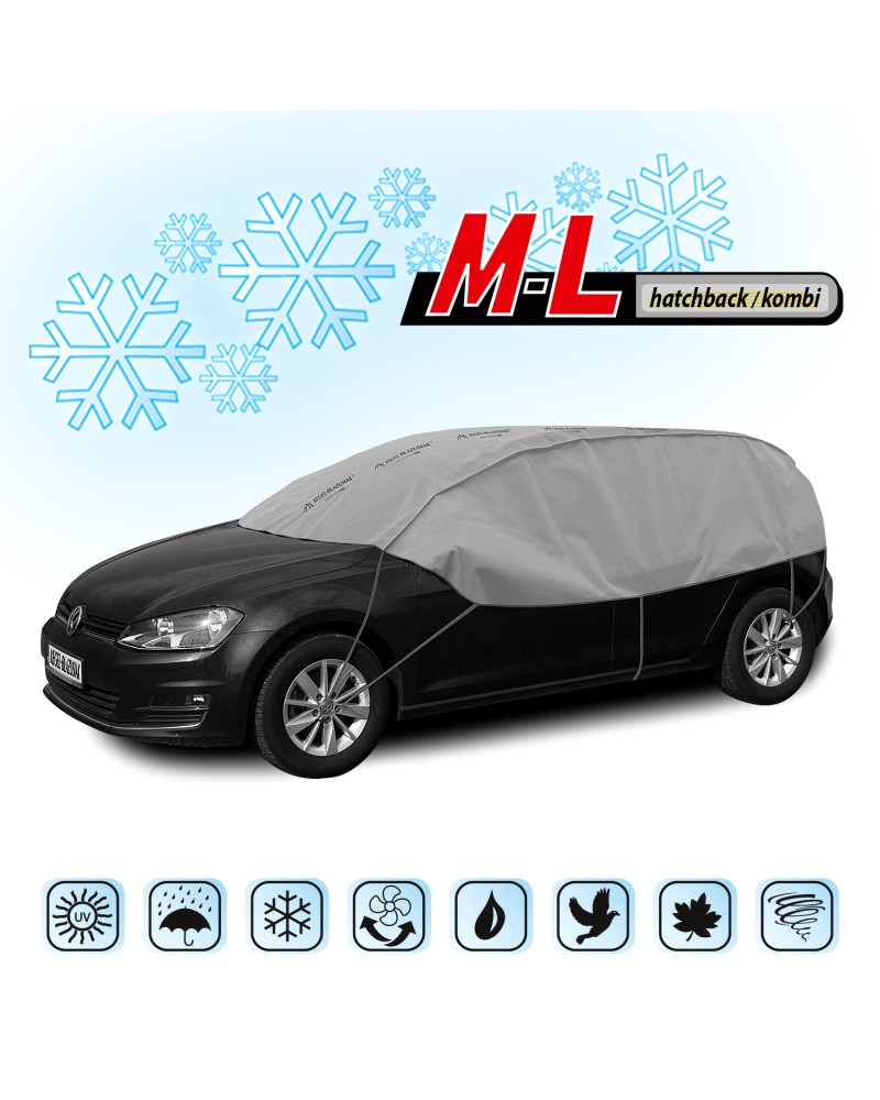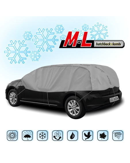 La demi housse OPTIMIO, en hiver, protègera le toit, les vitres et les rétroviseurs de votre voiture du givre et de la neige. Elle recouvrira également les poignées et les serrures les protégeant ainsi contre le gel. La housse ne colle pas à la voiture sous l'effet de gel. Elle fournira une protection efficace du suintement des arbres, des déjections d'oiseaux et du pollen, et même contre les rayons UV. Par conséquent, elle peut être appliquée en toutes saisons de l'année.