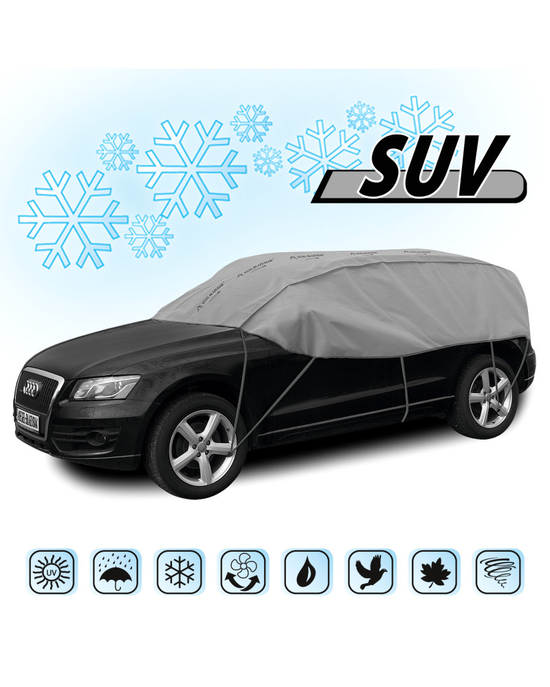 La demi housse OPTIMIO, en hiver, protègera le toit, les vitres et les rétroviseurs de votre voiture du givre et de la neige. Elle recouvrira également les poignées et les serrures les protégeant ainsi contre le gel. La housse ne colle pas à la voiture sous l'effet de gel. Elle fournira une protection efficace du suintement des arbres, des déjections d'oiseaux et du pollen, et même contre les rayons UV. Par conséquent, elle peut être appliquée en toutes saisons de l'année.