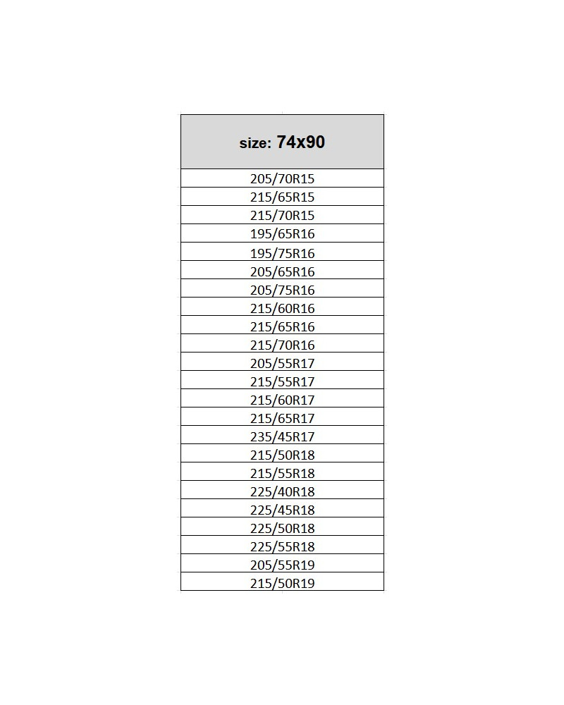 205/70R15, 215/65R15, 215/70R15, 195/65R16, 195/75R16, 205/65R16, 205/75R16, 215/60R16, 215/65R16, 215/70R1, 205/55R17, 215/55R17, 215/60R17, 215/65R17, 235/45R17, 215/50R18, 215/55R18, 225/40R18, 225/45R18, 225/50R18, 225/55R18, 205/55R19, 215/50R19.