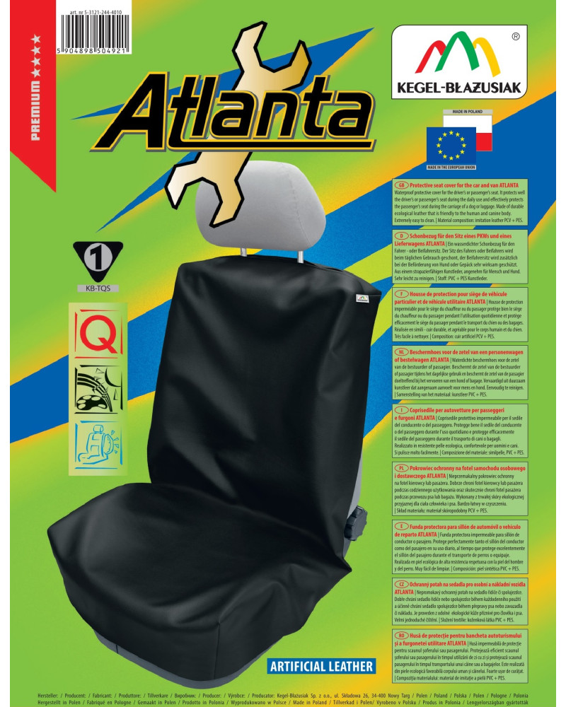 Housse de protection ATLANTA - en cuir écologique de nouvelle génération- assurera une protection fiable à votre fauteuil. Il est fait d'un tissus extrêmement durable, résistant à l'huile et imperméable à l'eau, résistant à divers types de dommages. Une ouverture spéciale dans la housse permettra également de retirer l'appuie-tête. Taille universelle elle convient à tous les sièges d'auto standards. Produit écologique, réutilisable. Elle est très facile à mettre et à enlever ; confortable à transporter, une fois pliée elle ne prend pas beaucoup de place. Facile à nettoyer. En achetant nos housses, vous pouvez être sûr de recevoir un produit de la plus haute qualité. Housse de protection fonctionne parfaitement dans les garages. Destiné à transporter un chien, des outils sales ou un bagage dans le siège avant de la voiture. Elle sert aux gens qui portent des vêtements de travail sales. La housse de protection ATLANTA est en couleur noir universelle, adaptéeà l'intérieur de chaque voiture et extrêmement pratique à utiliser. La conception appropriée de la housse permet de recouvrir l'ensemble du fauteuil - dossier, siège avec côtés du fauteuil. Une ouverture spéciale dans le tissu permet de retirer l'appui-tête. C'est un produit écologique et économique - réutilisable, facile à nettoyer. Très facile à installer et à enlever.