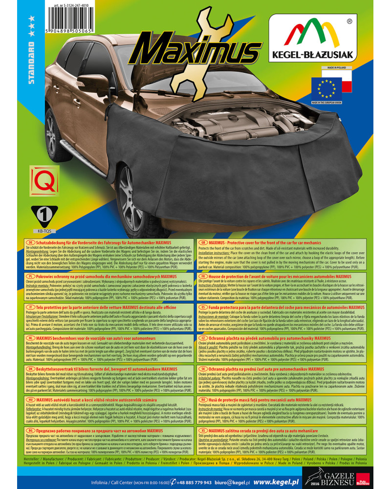 La housse de protection MAXIMUS est fabriquée dans une couleur noire universelle, grâce à laquelle elle a un bel aspect et est extrêmement pratique à utiliser. Elle est très facile à nettoyer - toute saleté peut être enlevée avec un chiffon humide avec du liquide. La couverture est facile et sûre à installer. Comme nous l'avons déjà mentionné, toute la partie avant de la housse est doublée d'un matériau antidérapant. Les parties latérales, en revanche, sont dotées de "languettes" spéciales en matériau antidérapant qui peuvent être posées sur les garde-boue ou passées par-dessus le bord du compartiment moteur. En outre, pour une meilleure tenue, la housse est munie d'élastiques aux extrémités pour la fixer aux miroirs. L'ensemble est très solidement fixé, sans utiliser d'éléments métalliques, ce qui le rend très sûr pour les revêtements peinture.