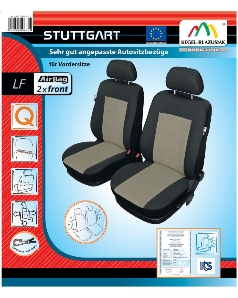 Les housses STUTTGART sont fabriquées à partir de tissus jacquard solides et de haute qualité, utilisées par la plupart des constructeurs automobiles. Les côtés des housses auto sont toujours noirs, et les centres sont de couleur cendrée ou beige clair - lisse ou avec un motif fin (selon les lots de produits). Grâce à l'utilisation de ces matériaux, les housses auto Stuttgart sont à la fois de bonne qualité et d'un coût sans précédent. Nous proposons des housses auto STUTTGART à un prix très attractif et il convient de mentionner que la qualité de fabrication est égale à celle des modèles plus chers. Les housses ont été soigneusement conçues et testées, de sorte qu'elles s'adaptent à des sièges de voiture spécifiques - elles s'adaptent bien sur les sièges et reflètent la plupart de leurs détails.