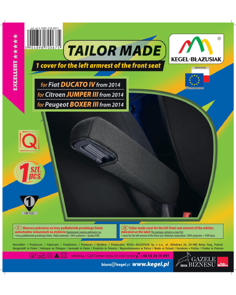 cHousse de protection sur mesure pour un accoudoir droit du siège avant, adaptée aux véhicules indiqués sur l'étiquette.
