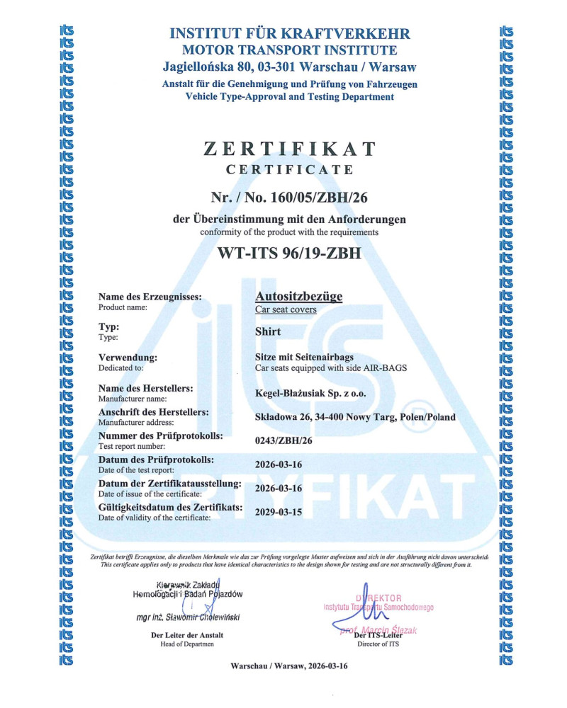 La sécurité de nos housses de protections sont confirmées par le certificat et les recherches réalisés par l'Institut de Transport Automobile.