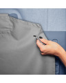 Déplier le rideau à l'intérieur de la cabine du véhicule. Le bord supérieur du rideau comporte deux poches qui doivent être posées sur les pare-soleils au-dessus du pare-brise et attachées aux pare-soleils à l'aide de bandes Velcro cousues. Les bords supérieurs latéraux du rideau sont munis de rabats terminés par des bandes Velcro, qui permettent de fixer le rideau aux poignées de la voiture situées au-dessus de la porte avant. Des crochets sont cousus aux extrémités du bord supérieur du rideau, qui doivent être accrochés aux bords supérieurs des panneaux couvercles en plastique de piliers de la voiture. Ensuite, placer le bord inférieur du rideau avec la charge cousue, sur le tableau de bord du véhicule, aussi près que possible du bord inférieur du pare-brise. Le produit est destiné à être utilisé dans un véhicule en stationnement uniquement, et ne peut pas être utilisé pendant la conduite.