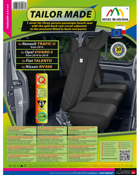 -1 housse pour triple banquette passager à dossier divisé (housse adaptée aux accoudoirs, instalés dans des parties latérales du dossier)
