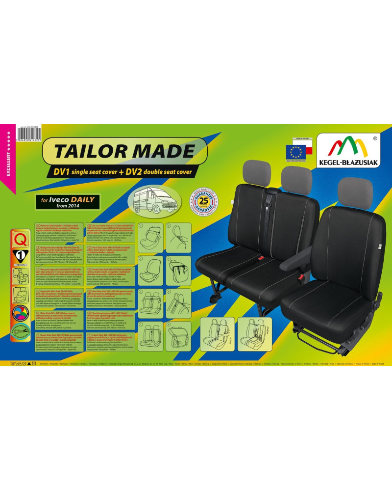 Housse de siège AUTO sur mesure + Banquette 2 places pour IVECO DAILY, sont fabriquées à partir de matériaux d'ameublement de haute qui, combinés au soin de finir même les plus petits détails, satisferont les clients les plus exigeants. Grâce à la construction appropriée, les housses auto s'adaptent parfaitement aux sièges et la stratification à l'intérieur du matériau avec de la mousse PUR ignifuge les empêche de glisser. La fabrication professionnelle à partir de matériaux de haute qualité garantit une longue durée de vie.