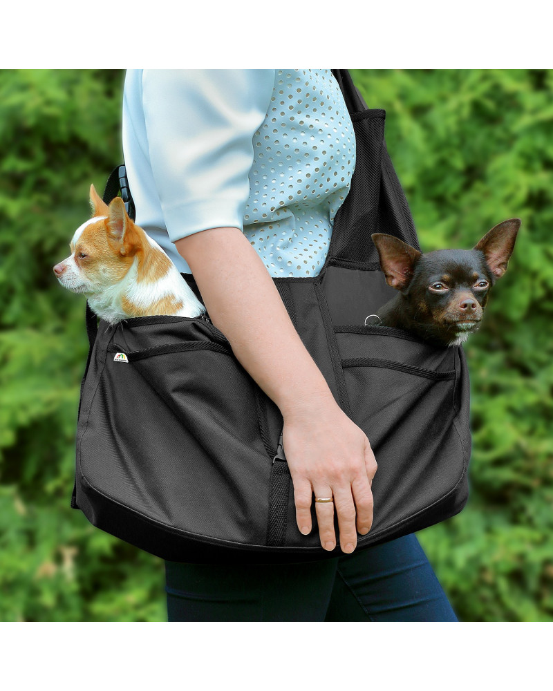 Le sac a un fond renforcé pour offrir au chien une base solide ainsi que des poches pour ranger les petits objets comme le smartphone, les laisses, les friandises, etc. Le sac offre au gardien de chien, non seulement un moyen facile et confortable de transporter l'animal, mais aussi une liberté de mouvement de ses mains, qui sont libres.