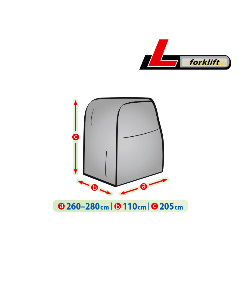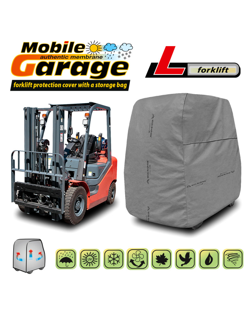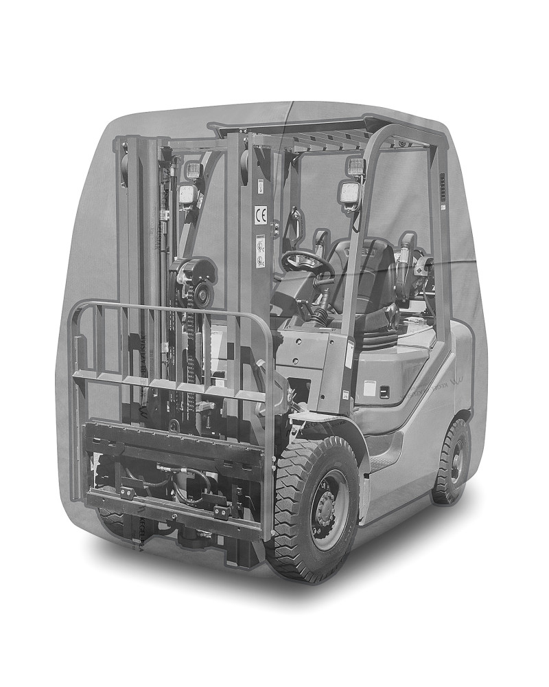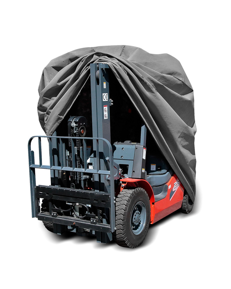 La housse de protection imperméable pour protéger un chariot élévateur à fourche gardé à l'extérieur, contre les impacts négatifs de l'environnement. La housse convient également pour une utilisation en intérieur. Elle protège contre la pluie, la neige, le givre et le rayonnement solaire(UV nocifs) et les impuretés telles que la poussière, les fientes d'oiseaux et les sèves d'arbres. La housse de membrane, imperméable et "respirante" qui évacue l'humidité du dessous de la housse vers l’extérieur. La housse résiste aux intempéries.