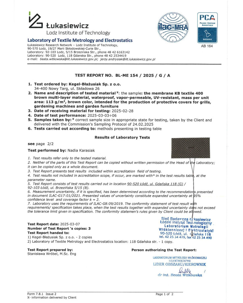 La durabilité des housses de protection - bâches est déterminée par leur résistance au rayonnement solaire (UV), des températures élevées, la pluie, le froid, la neige et les impuretés naturelles. Nos spécialistes ont développé des méthodes efficaces pour tester la résistance des matériaux aux conditions externes sur la base de leurs propres essais environnementaux de nombreuses années et de la norme d’essai PN-EN ISO 4892-3. Chaque livraison de matériaux à partir desquels sont fabriquées des housses de protection - bâches Kegel-Blażusiak, est soigneusement examiné dans la chambre d’essai de vieillissement Atlas UVtest des Etats-Unis. Grâce au contrôle de la qualité des matériaux et aux tests environnementaux à long terme, nous garantissons à nos clients plusieurs années de durabilité de nos housses de protection - bâches, même lors de l’utilisation intense.