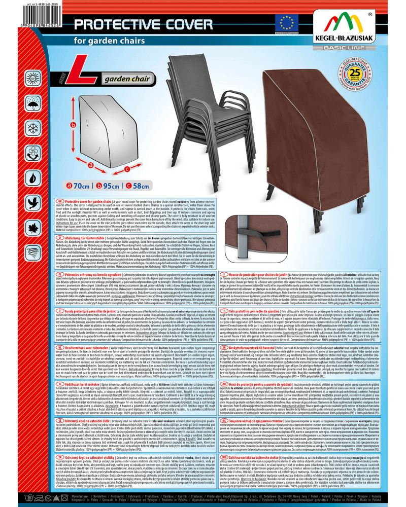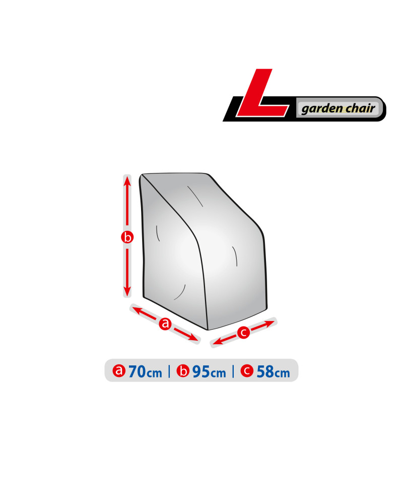La housse de protection pour chaises de jardin, gardées à l’extérieur, utilisable tout au long de l'année contre les impacts négatifs de l'environnement. La housse est destinée pour une ou plusieures chaises empilables. Grâce à sa conception spéciale, l'eau, lors de la pluie, s'écoule par dessus de la housse sans y pénétrer, et la vapeur d'eau est évacuée vers l'extérieur. Elle protège les chaises de jardin contre la pluie, la neige, le givre et le rayonnement solaire(UV nocifs) et les impuretés telles que la poussière, les fientes d'oiseaux et les sèves d'arbres. La housse réduit la corrosion et le vieillissement des éléments en plastique ou en bois, elle protège contre la décoloration et le ternissement du vernis et des éléments chromés. La housse est entièrement résistante à toutes les conditions atmosphériques. Facile à mettre et à enlever. Des fixations supplémentaires empêchent que la housse ne soit enlevée par le vent. La housse convient également, pour être utilisée à l’intérieur.