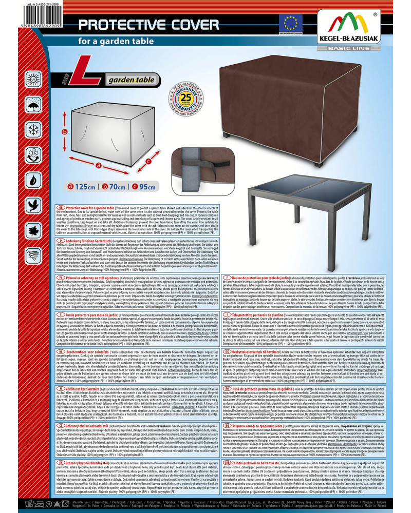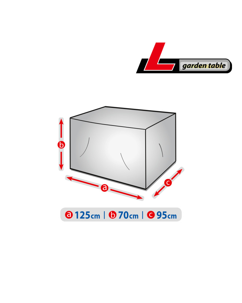 La housse de protection pour table de jardin, gardée à l’extérieur, utilisable tout au long de l'année, contre les impacts négatifs de l'environnement. Grâce à sa conception spéciale, l'eau, lors de la pluie, s'écoule par dessus de la housse sans y pénétrer. Elle protège la table de jardin contre la pluie, la neige, le givre et le rayonnement solaire(UV nocifs) et les impuretés telles que la poussière, les fientes d'oiseaux et les sèves d'arbres. La housse réduit la corrosion et le vieillissement des éléments en plastique ou en bois, elle protège contre la décoloration et le ternissement du vernis et des éléments chromés. La housse est entièrement résistante à toutes les conditions atmosphériques. Facile à mettre et à enlever. Des fixations supplémentaires empêchent que la housse ne soit enlevée par le vent. La housse convient également, pour être utilisée à l’intérieur.
