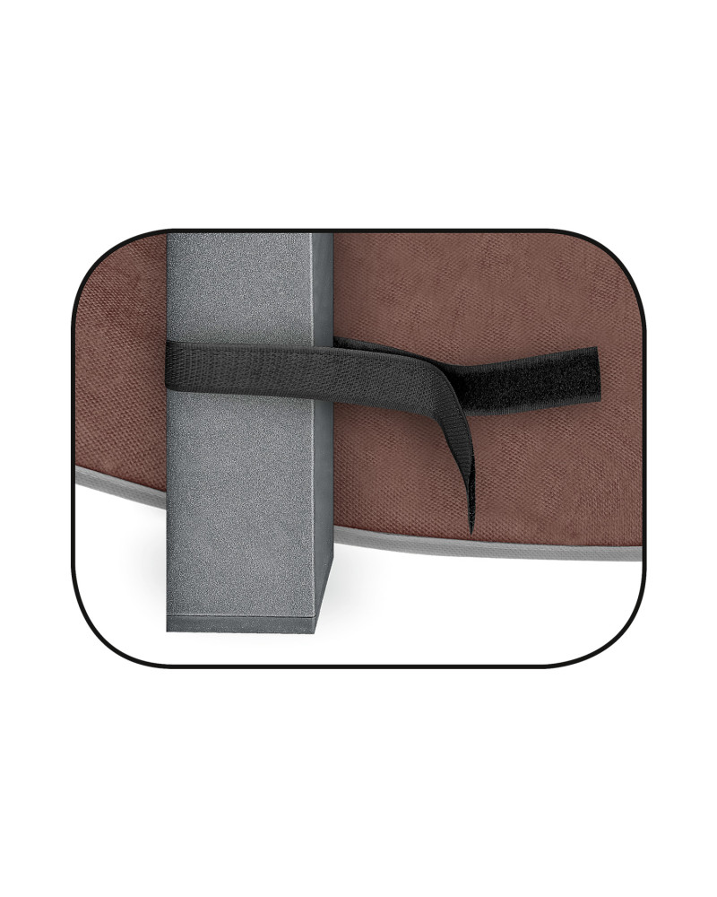 Mettre la housse sur la table propre et sèche, le côté avec des finitions de couture cendrées vers l'extérieur, puis fixer la housse aux pieds de la table à l'aide de bandes « Velcro » cousues sur la face intérieure du bas de la housse. Ne pas utiliser la housse lors du transport de la table de jardin sur des porte-bagages extérieurs et non couverts.