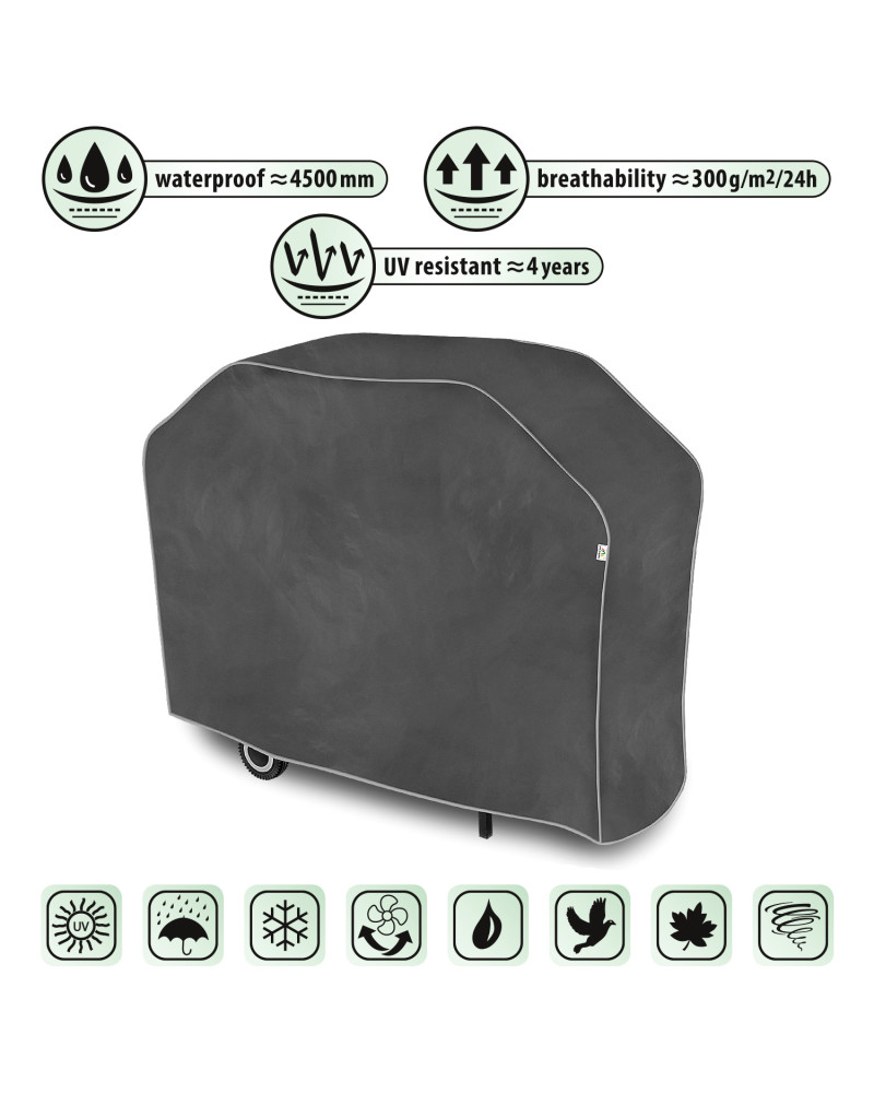 La housse de protection à membrane, imperméable mais en même temps perméable à la vapeur, pour protéger votre barbecue de jardin au charbon de bois ou au gaz, gardé à l'extérieur, contre les impacts négatifs de l'environnement. La housse résistante aux intempéries, entièrement composée d'une membrane à très haute perméabilité à la vapeur. La housse imperméable même en cas de forte pluie et en même temps perméable à la vapeur évacue l'humidité du dessous de la housse vers l'extérieur. Elle protège le barbecue de jardin contre la pluie, la neige, le givre et le rayonnement solaire(UV nocifs) ainsi que les impuretés telles que la poussière, les fientes d'oiseaux et les sèves d'arbres. Facile à mettre et à enlever. Des attaches supplémentaires empêchent que la housse ne soit enlevée par le vent. La housse peut également être utilisée à l’intérieur.