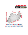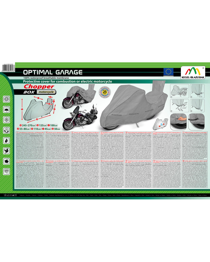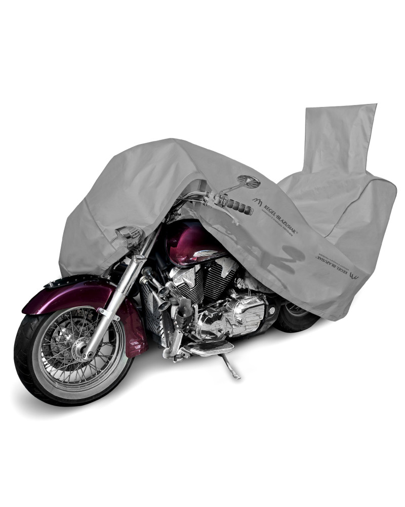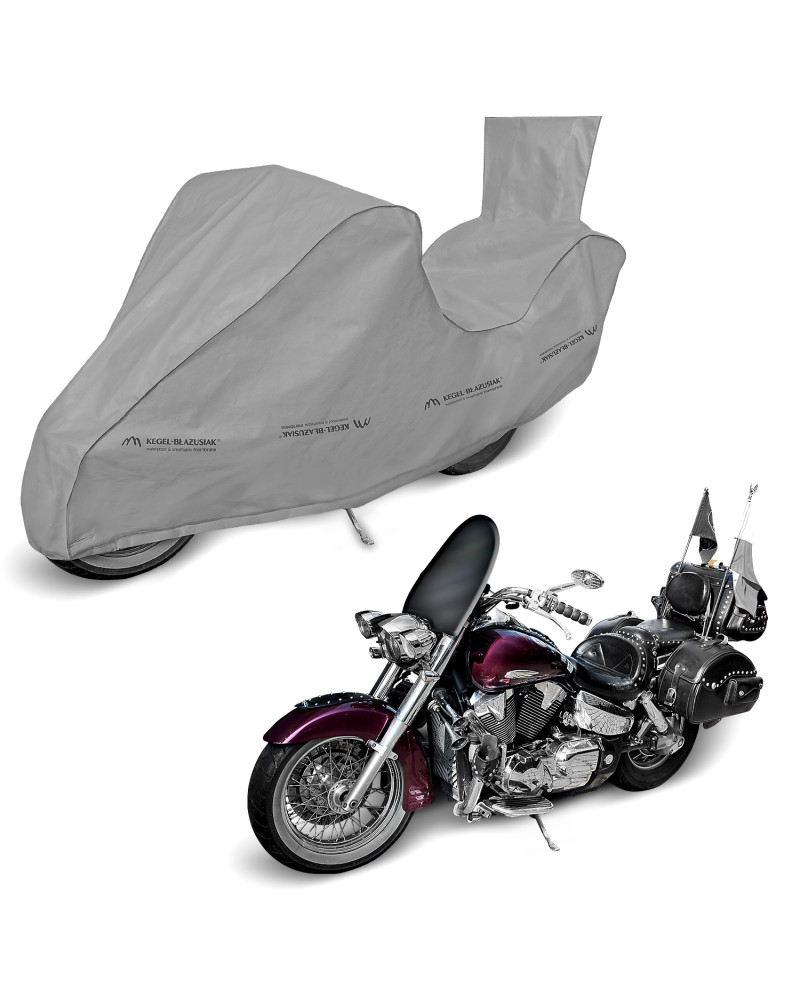 La housse de membrane, imperméable mais en même temps perméable à la vapeur pour la protection d’une motocyclette à combustion interne ou électrique contre les impacts négatifs de l'environnement. La housse résiste aux intempéries, et elle est entièrement composée d'une membrane à haute perméabilité à la vapeur. Imperméable même en cas de forte pluie et en même temps perméable à la vapeur, évacuant l'humidité du dessous de la housse vers l'extérieur. Elle protège contre la pluie, la neige, le givre et le rayonnement solaire(UV nocifs) et les impuretés telles que la poussière, les fientes d'oiseaux et les sèves d'arbres. La housse réduit la corrosion et le vieillissement des éléments en plastique, elle protège contre la décoloration et le ternissement du vernis et des éléments chromés. Elle convient pour le stockage extérieur à long terme ou à court terme d'une motocyclette à combustion interne ou pour le stockage à court terme d'une motocyclette électrique. Elle convient également, pour être utilisée à l’intérieur. Un cordon de serrage et des attaches supplémentaires sous la moto empêchent que la housse ne soit enlevée par le vent. Il y a des trous faits dans la housse pour permettre d'attacher la moto couverte de la housse, par la roue avant à l'aide d'un antivol ou d'une chaîne.