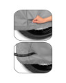 Garer la moto à l'abri du vent de manière à ce qu'elle ne puisse pas se renverser. Mettre la housse, la face imprimée vers l'extérieur, sur la moto propre et sèche, après que le pot d'échappement et tous les composants du moteur ont été refroidis (moto à combustion interne) ou après que l'alimentation a été coupée (moto électrique). Croiser les cordons de serrage et tendez-les, en dirigeant les forces parallèlement à l'arrière de la motocyclette (voir figure 2). Nouer les cordons de serrage et vérifier si le nœud ne se desserre pas, après avoir tiré sur le tendeur. Si le nœud se desserre, répéter l'action en modifiant la façon de nouer les cordons. Puis attacher la housse sous la moto à l'aide de bandes 'Velcro' cousues sur la partie intérieure du bas de la housse. Il faut bien s’assurer que les deux paires de bandes Velcro ont été bien attachées sous la motocyclette. Ne pas utiliser la housse lors du chargement de la batterie installée sur la moto ou lors du transport de celle-là sur les porte-bagages extérieurs ou sur des remorques non couvertes. Ne pas utiliser la housse si elle est abîmée, sale à l’intérieur ou si elle fuit.