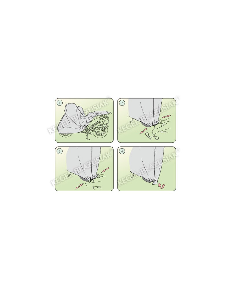 Housser votre motocycle relativement propre en mettant la face avec une bande blanche au milieu côté intérieur, tendre ensuite la corde au maximum et faire un nœud. Seul un laçage correct vous garantira la résistance de la fixation. Nouer la corde conformément à la notice pour avoir la certitude que la housse est fixée solidement et votre véhicule est bien à l'abri. Si vous suivez la consigne les deux extrémités de la corde seront serrées solidement tout en vous offrant la possibilité de les dénouer rapidement.