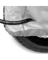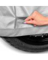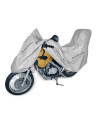 La housse de membrane, imperméable mais en même temps perméable à la vapeur pour la protection d’une motocyclette à combustion interne ou électrique contre les impacts négatifs de l'environnement. La housse résiste aux intempéries, et elle est entièrement composée d'une membrane à haute perméabilité à la vapeur. Imperméable même en cas de forte pluie et en même temps perméable à la vapeur, évacuant l'humidité du dessous de la housse vers l'extérieur. Elle protège contre la pluie, la neige, le givre et le rayonnement solaire(UV nocifs) et les impuretés telles que la poussière, les fientes d'oiseaux et les sèves d'arbres. La housse réduit la corrosion et le vieillissement des éléments en plastique, elle protège contre la décoloration et le ternissement du vernis et des éléments chromés. Elle convient pour le stockage extérieur à long terme ou à court terme d'une motocyclette à combustion interne ou pour le stockage à court terme d'une motocyclette électrique. Elle convient également, pour être utilisée à l’intérieur. Un cordon de serrage et des attaches supplémentaires sous la moto empêchent que la housse ne soit enlevée par le vent. Il y a des trous faits dans la housse pour permettre d'attacher la moto couverte de la housse, par la roue avant à l'aide d'un antivol ou d'une chaîne.
