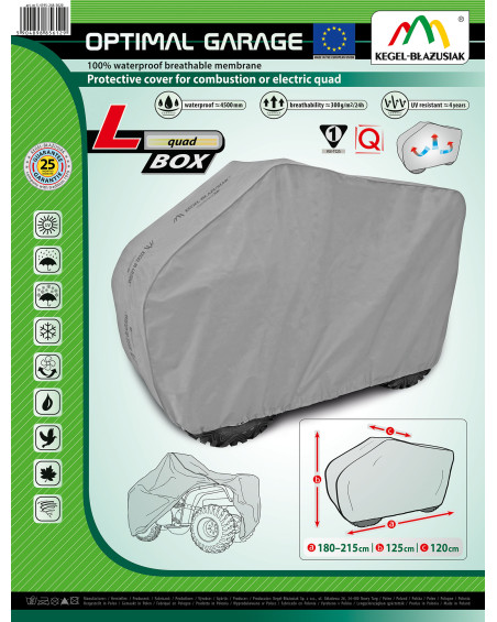 Une housse de quad pour les amateurs des quatre-roues., hydrofuge et perméable à la vapeur. Le matériau est presque entièrement étanche tout en permettant l'évaporation de l'humidité s'accumulant à l'intérieur de la housse, protégeant ainsi de l'apparition de la rouille. La housse offre la protection du quad entier, avec sa partie inférieure, contre les effets destructifs du milieu. Elle résiste à l'action des rayons UV. Fixée à l'aide de la corde élastique autour du quad entier, la housse protège même en cas de vent élevé. Grâce à une variété des versions de dimensions différentes vous trouverez toujours une housse qui sera bien ajustée à votre quad. La garantie de 25 mois dont sont couvertes les housses vous donne l'assurance d'avoir choisi un article de haute qualité.