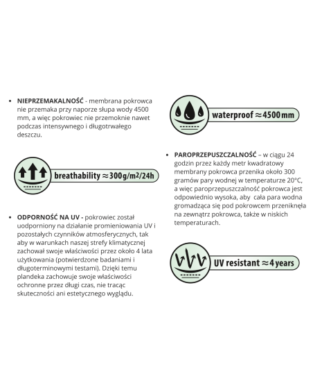 imperméable même en cas de forte pluie et en même temps perméable à la vapeur, évacuant l'humidité du dessous de la housse vers l'extérieur