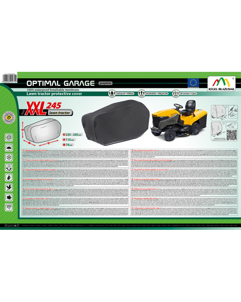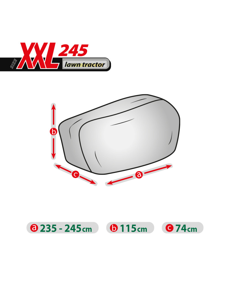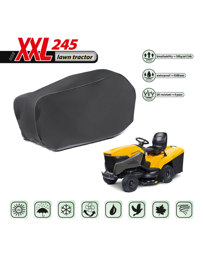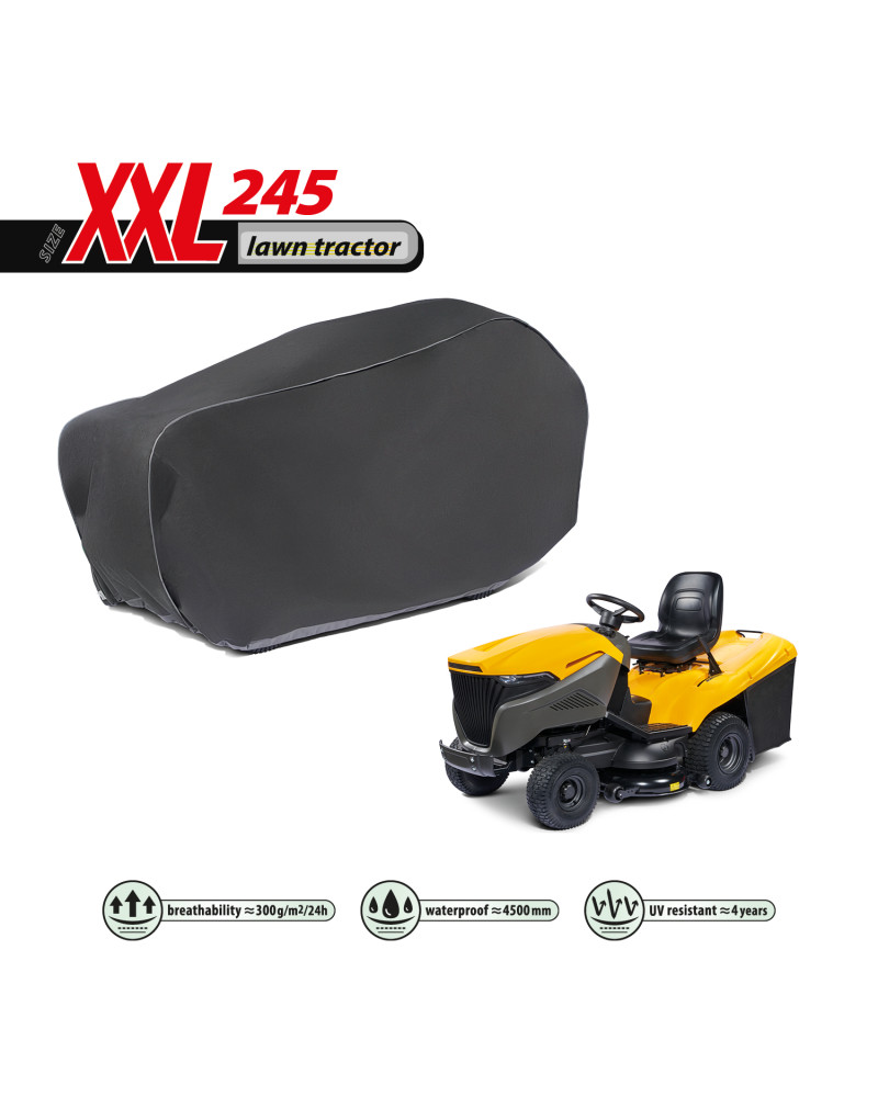 La housse de protection pour tracteur tondeuse à essence, gardé à l’extérieur, utilisable tout au long de l'année contre les impacts négatifs de l'environnement. Grâce à sa conception spéciale, l'eau, lors de la pluie, s'écoule par dessus de la housse sans y pénétrer, et la vapeur d'eau est évacuée vers l'extérieur. Elle protège le tracteur tondeuse contre la pluie, la neige, le givre et le rayonnement solaire(UV nocifs) et les impuretés telles que la poussière, les fientes d'oiseaux et les sèves d'arbres. La housse réduit la corrosion et le vieillissement des éléments en plastique, elle protège contre la décoloration et le ternissement du vernis et des éléments chromés. La housse est entièrement résistante à toutes les conditions atmosphériques. Elle est fixée à l’aide d'un bord-côtes avec un cordon, ce qui permet de la fixer de manière sûre, tout en étant facile à mettre et à enlever. La housse convient également, pour être utilisée à l’intérieur.