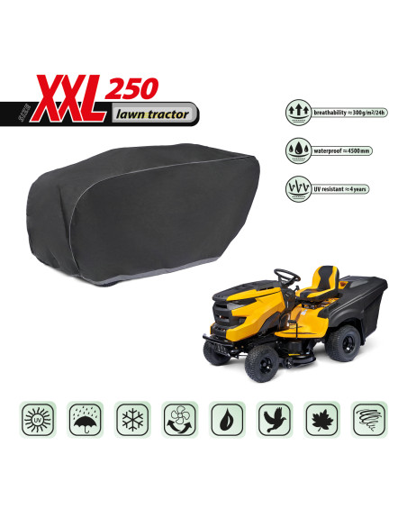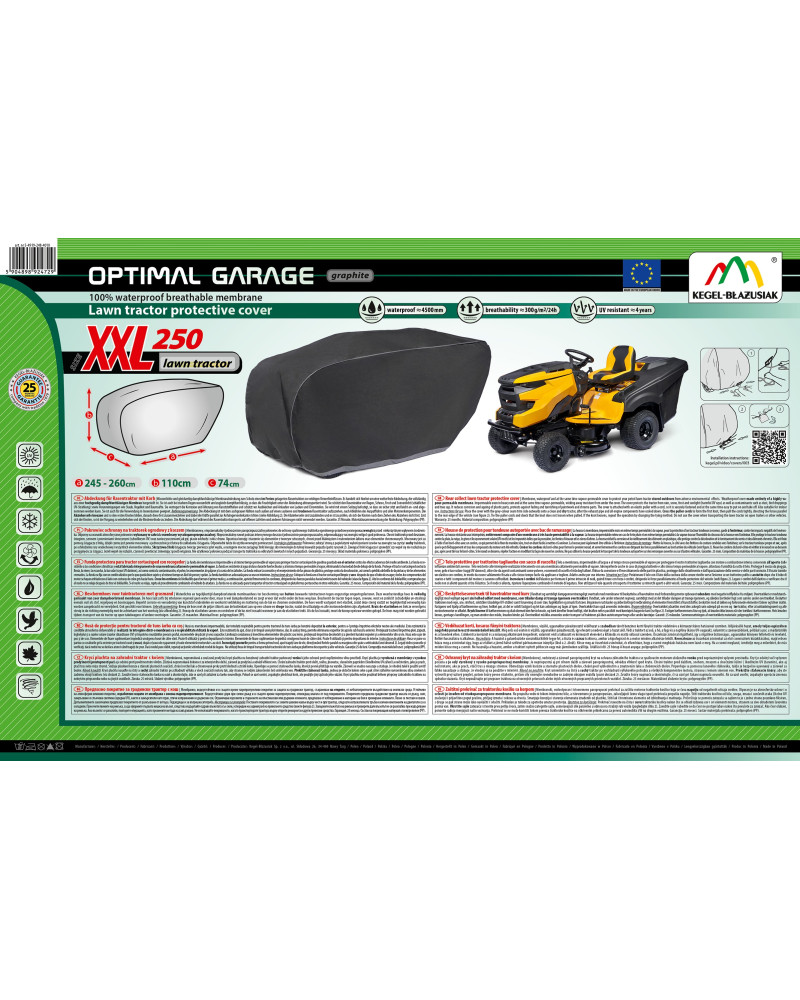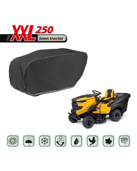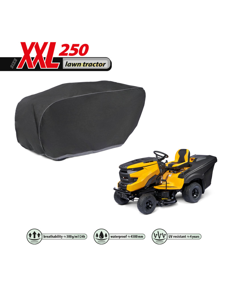 La housse de protection pour tracteur tondeuse à essence, gardé à l’extérieur, utilisable tout au long de l'année contre les impacts négatifs de l'environnement. Grâce à sa conception spéciale, l'eau, lors de la pluie, s'écoule par dessus de la housse sans y pénétrer, et la vapeur d'eau est évacuée vers l'extérieur. Elle protège le tracteur tondeuse contre la pluie, la neige, le givre et le rayonnement solaire(UV nocifs) et les impuretés telles que la poussière, les fientes d'oiseaux et les sèves d'arbres. La housse réduit la corrosion et le vieillissement des éléments en plastique, elle protège contre la décoloration et le ternissement du vernis et des éléments chromés. La housse est entièrement résistante à toutes les conditions atmosphériques. Elle est fixée à l’aide d'un bord-côtes avec un cordon, ce qui permet de la fixer de manière sûre, tout en étant facile à mettre et à enlever. La housse convient également, pour être utilisée à l’intérieur.