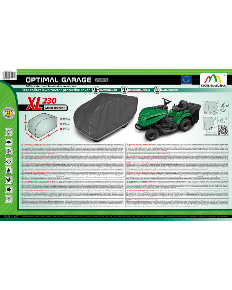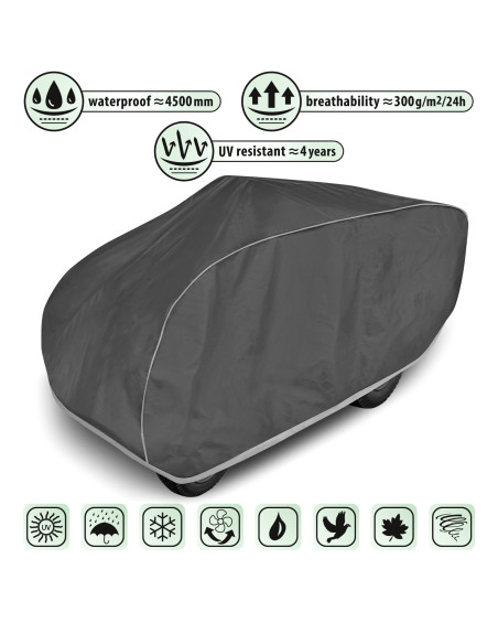 La housse à membrane, imperméable mais en même temps perméable à la vapeur, pour la protection d’un tracteur tondeuse à essence, gardé à l’extérieur, contre les impacts négatifs de l'environnement. La housse résistante aux intempéries, entièrement composée d'une membrane à très haute perméabilité à la vapeur. La housse imperméable même en cas de forte pluie et en même temps perméable à la vapeur évacue l'humidité du dessous de la housse vers l'extérieur. Elle protège le tracteur tondeuse contre la pluie, la neige, le givre et le rayonnement solaire(UV nocifs) et les impuretés telles que la poussière, les fientes d'oiseaux et les sèves d'arbres. La housse réduit la corrosion et le vieillissement des éléments en plastique, elle protège contre la décoloration et le ternissement du vernis et des éléments chromés.