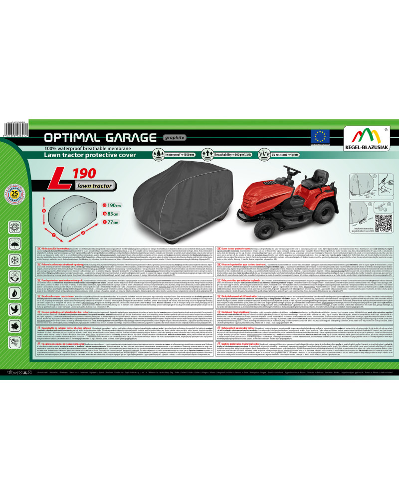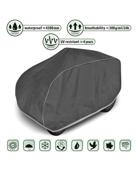 La housse à membrane, imperméable mais en même temps perméable à la vapeur, pour la protection d’un tracteur tondeuse à essence, gardé à l’extérieur, contre les impacts négatifs de l'environnement. La housse résistante aux intempéries, entièrement composée d'une membrane à très haute perméabilité à la vapeur. La housse imperméable même en cas de forte pluie et en même temps perméable à la vapeur évacue l'humidité du dessous de la housse vers l'extérieur. Elle protège le tracteur tondeuse contre la pluie, la neige, le givre et le rayonnement solaire(UV nocifs) et les impuretés telles que la poussière, les fientes d'oiseaux et les sèves d'arbres. La housse réduit la corrosion et le vieillissement des éléments en plastique, elle protège contre la décoloration et le ternissement du vernis et des éléments chromés.