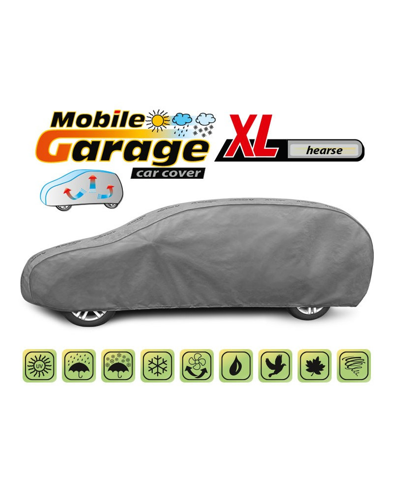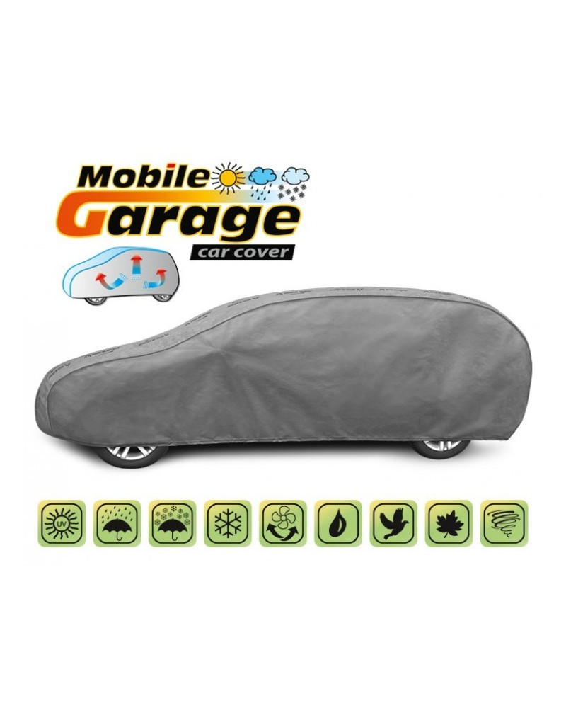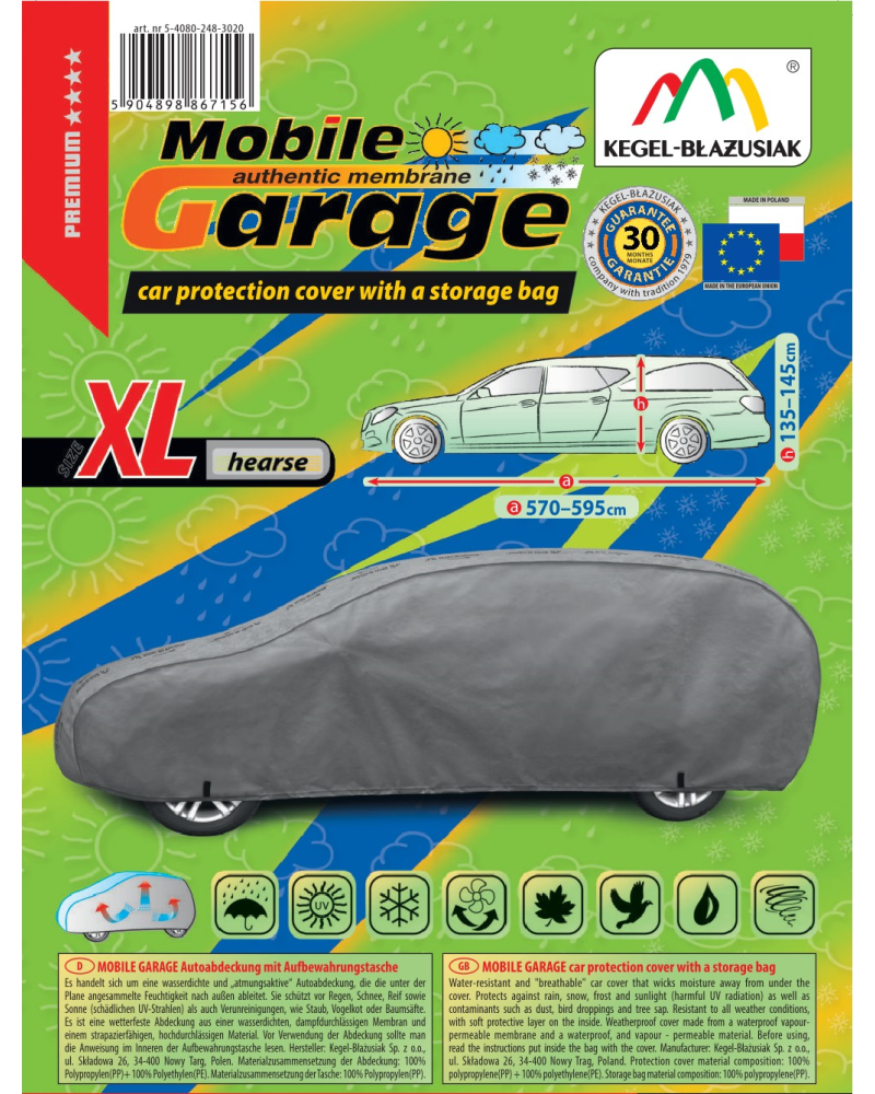 La housse de MOBILE GARAGE de haute qualité est un produit adapté aux besoins des conducteurs. Elle est composée de 4 couches de matériaux épais, solides et durables. La housse protège l'ensemble de la voiture contre les influences néfastes de l'environnement. La housse Mobile Garage est la protection idéale pour votre véhicule tout au long de l'année. Sa fonctionnalité peut être appréciée en toute saison. En hiver, il empêche l'accumulation de neige, de givre et de glace et résiste au gel ; en automne, il protège contre la pluie, le vent, les feuilles, la sève des arbres ; et en été et au printemps, il protège contre les rayons UV, la poussière et les fientes d'oiseaux. Les propriétés particulières du matériau multicouche garantissent que la housse ne se mouille pas, tout en permettant à la vapeur d'eau de s'échapper du dessous de la housse vers l'extérieur. Toute trace d'humidité qui s'accumule sous la bâche s'évapore rapidement, évitant ainsi la rouille de la voiture et la formation de moisissures. La housse convient à une utilisation immédiate ou à long terme. La housse peut être lavée à la main à 40 degrés.