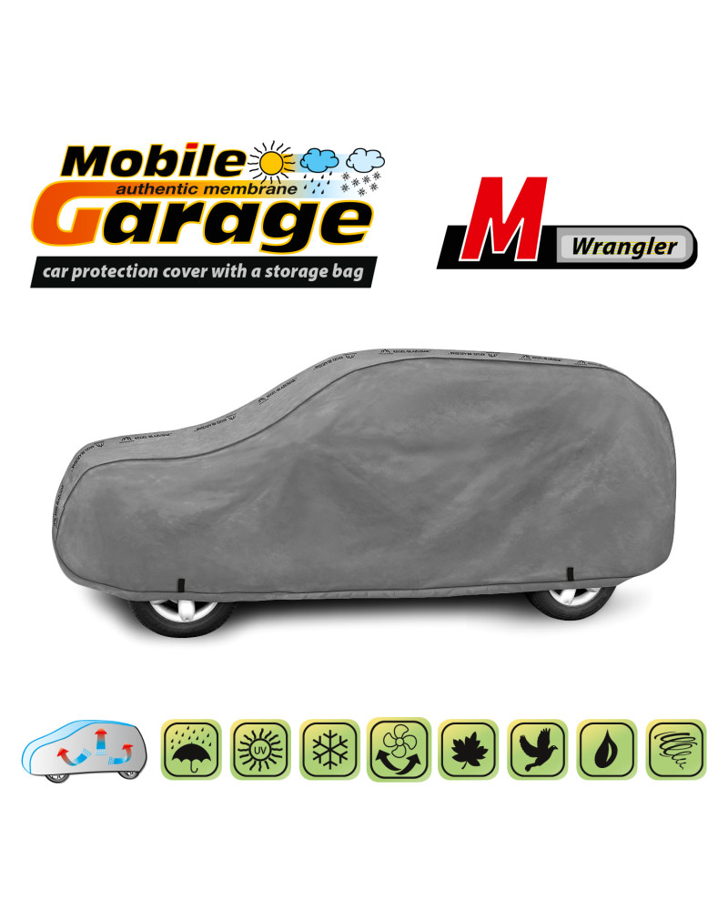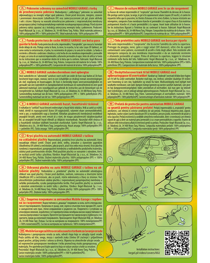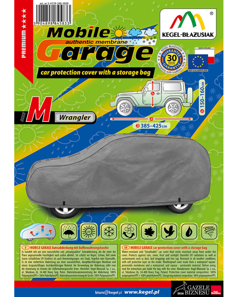La housse de MOBILE GARAGE de haute qualité est un produit adapté aux besoins des conducteurs. Elle est composée de 4 couches de matériaux épais, solides et durables. La housse protège l'ensemble de la voiture contre les influences néfastes de l'environnement. La housse Mobile Garage est la protection idéale pour votre véhicule tout au long de l'année. Sa fonctionnalité peut être appréciée en toute saison. En hiver, il empêche l'accumulation de neige, de givre et de glace et résiste au gel ; en automne, il protège contre la pluie, le vent, les feuilles, la sève des arbres ; et en été et au printemps, il protège contre les rayons UV, la poussière et les fientes d'oiseaux. Les propriétés particulières du matériau multicouche garantissent que la housse ne se mouille pas, tout en permettant à la vapeur d'eau de s'échapper du dessous de la housse vers l'extérieur. Toute trace d'humidité qui s'accumule sous la bâche s'évapore rapidement, évitant ainsi la rouille de la voiture et la formation de moisissures. La housse convient à une utilisation immédiate ou à long terme. La housse peut être lavée à la main à 40 degrés.