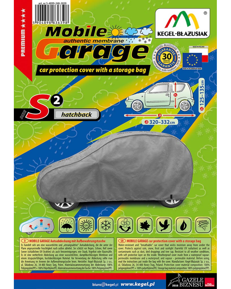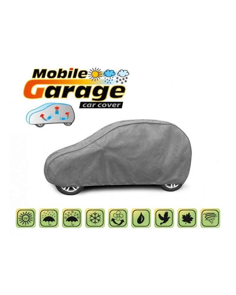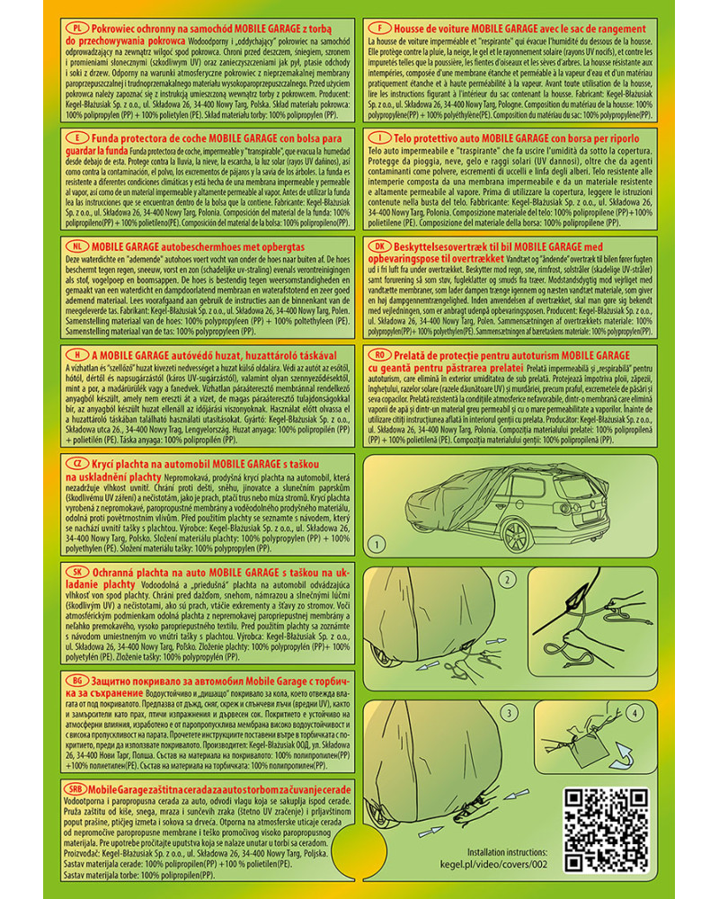 La housse de MOBILE GARAGE de haute qualité est un produit adapté aux besoins des conducteurs. Elle est composée de 4 couches de matériaux épais, solides et durables. La housse protège l'ensemble de la voiture contre les influences néfastes de l'environnement. La housse Mobile Garage est la protection idéale pour votre véhicule tout au long de l'année. Sa fonctionnalité peut être appréciée en toute saison. En hiver, il empêche l'accumulation de neige, de givre et de glace et résiste au gel ; en automne, il protège contre la pluie, le vent, les feuilles, la sève des arbres ; et en été et au printemps, il protège contre les rayons UV, la poussière et les fientes d'oiseaux. Les propriétés particulières du matériau multicouche garantissent que la housse ne se mouille pas, tout en permettant à la vapeur d'eau de s'échapper du dessous de la housse vers l'extérieur. Toute trace d'humidité qui s'accumule sous la bâche s'évapore rapidement, évitant ainsi la rouille de la voiture et la formation de moisissures. La housse convient à une utilisation immédiate ou à long terme. La housse peut être lavée à la main à 40 degrés.