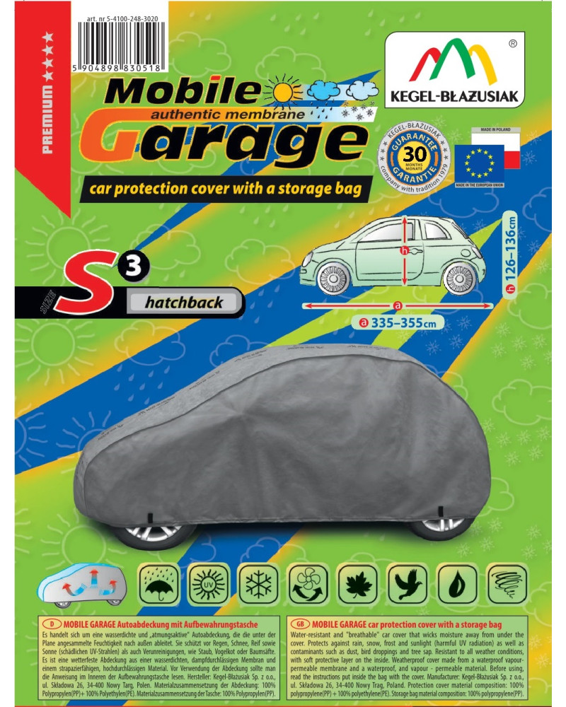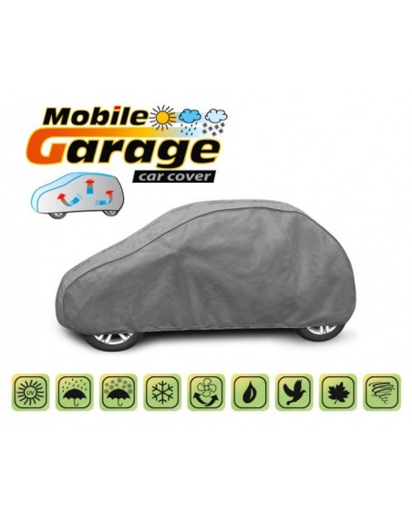 La housse de MOBILE GARAGE de haute qualité est un produit adapté aux besoins des conducteurs. Elle est composée de 4 couches de matériaux épais, solides et durables. La housse protège l'ensemble de la voiture contre les influences néfastes de l'environnement. La housse Mobile Garage est la protection idéale pour votre véhicule tout au long de l'année. Sa fonctionnalité peut être appréciée en toute saison. En hiver, il empêche l'accumulation de neige, de givre et de glace et résiste au gel ; en automne, il protège contre la pluie, le vent, les feuilles, la sève des arbres ; et en été et au printemps, il protège contre les rayons UV, la poussière et les fientes d'oiseaux. Les propriétés particulières du matériau multicouche garantissent que la housse ne se mouille pas, tout en permettant à la vapeur d'eau de s'échapper du dessous de la housse vers l'extérieur. Toute trace d'humidité qui s'accumule sous la bâche s'évapore rapidement, évitant ainsi la rouille de la voiture et la formation de moisissures. La housse convient à une utilisation immédiate ou à long terme. La housse peut être lavée à la main à 40 degrés.