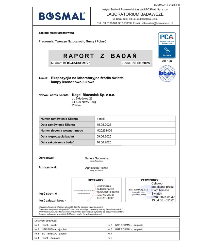 La durabilité des housses de protection - bâches est déterminée par leur résistance au rayonnement solaire (UV), des températures élevées, la pluie, le froid, la neige et les impuretés naturelles. Nos spécialistes ont développé des méthodes efficaces pour tester la résistance des matériaux aux conditions externes sur la base de leurs propres essais environnementaux de nombreuses années et de la norme d’essai PN-EN ISO 4892-3. Chaque livraison de matériaux à partir desquels sont fabriquées des housses de protection - bâches Kegel-Blażusiak, est soigneusement examiné dans la chambre d’essai de vieillissement Atlas UVtest des Etats-Unis. Grâce au contrôle de la qualité des matériaux et aux tests environnementaux à long terme, nous garantissons à nos clients plusieurs années de durabilité de nos housses de protection - bâches, même lors de l’utilisation intense.