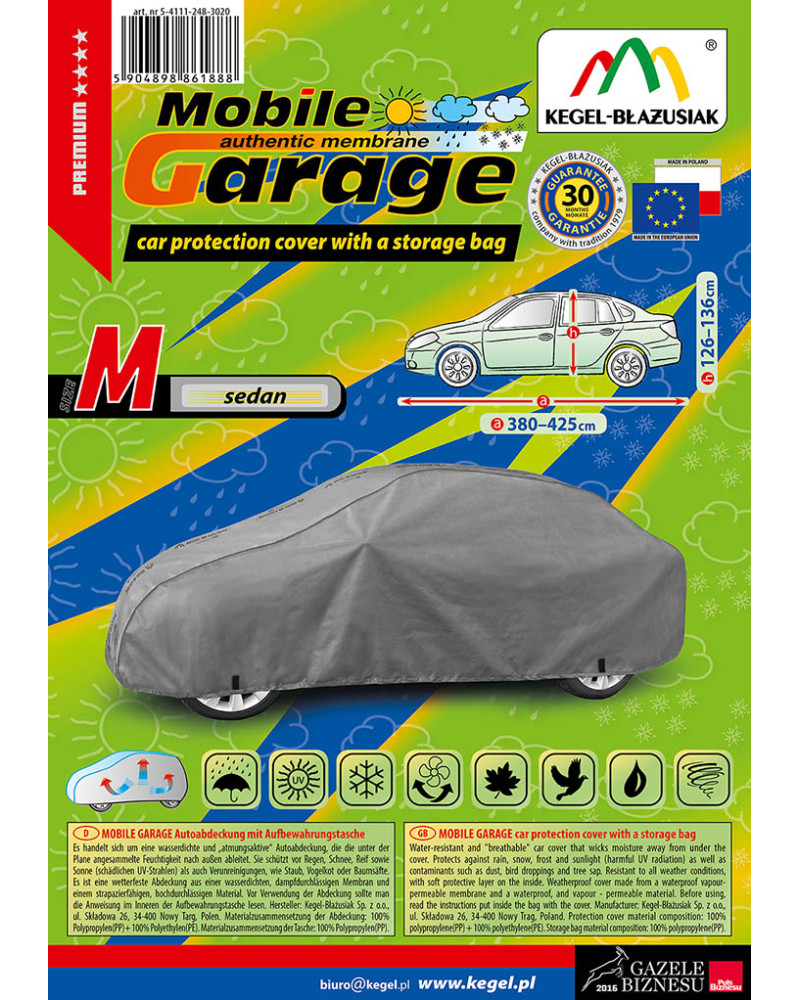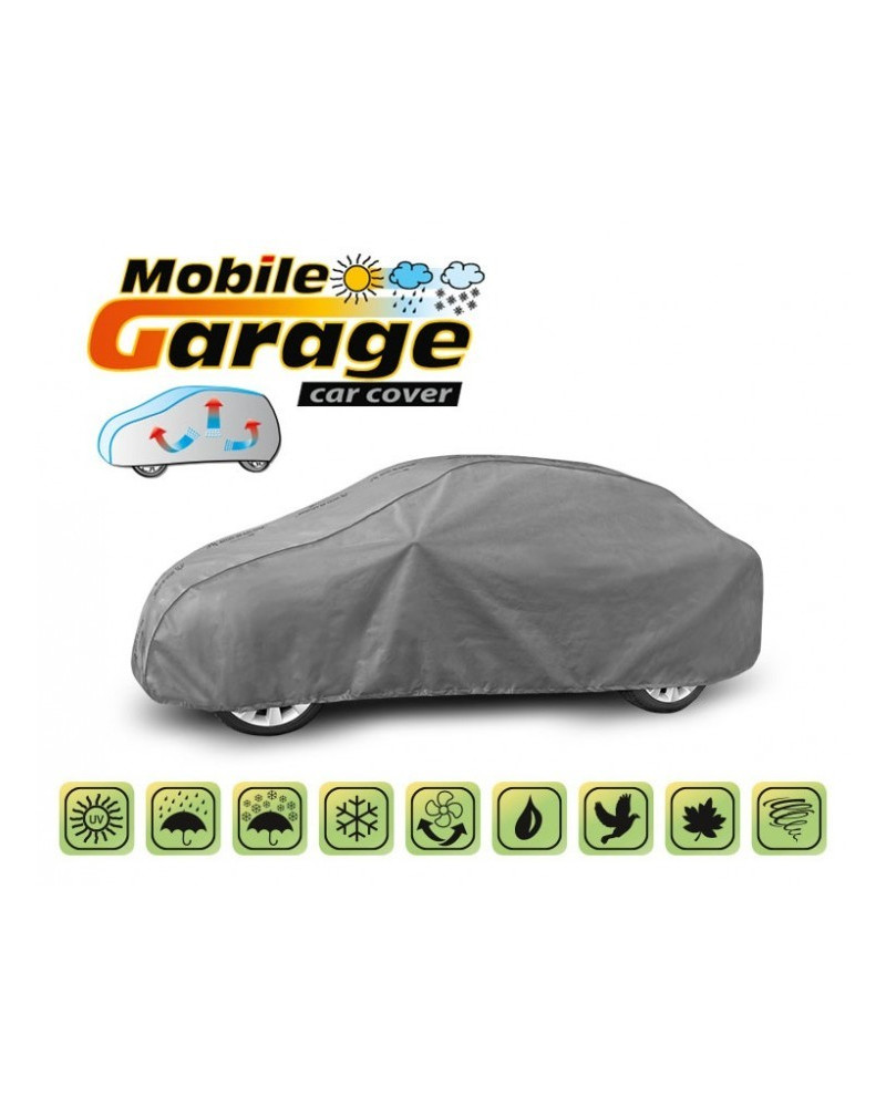 La housse de MOBILE GARAGE de haute qualité est un produit adapté aux besoins des conducteurs. Elle est composée de 4 couches de matériaux épais, solides et durables. La housse protège l'ensemble de la voiture contre les influences néfastes de l'environnement. La housse Mobile Garage est la protection idéale pour votre véhicule tout au long de l'année. Sa fonctionnalité peut être appréciée en toute saison. En hiver, il empêche l'accumulation de neige, de givre et de glace et résiste au gel ; en automne, il protège contre la pluie, le vent, les feuilles, la sève des arbres ; et en été et au printemps, il protège contre les rayons UV, la poussière et les fientes d'oiseaux. Les propriétés particulières du matériau multicouche garantissent que la housse ne se mouille pas, tout en permettant à la vapeur d'eau de s'échapper du dessous de la housse vers l'extérieur. Toute trace d'humidité qui s'accumule sous la bâche s'évapore rapidement, évitant ainsi la rouille de la voiture et la formation de moisissures. La housse convient à une utilisation immédiate ou à long terme. La housse peut être lavée à la main à 40 degrés.