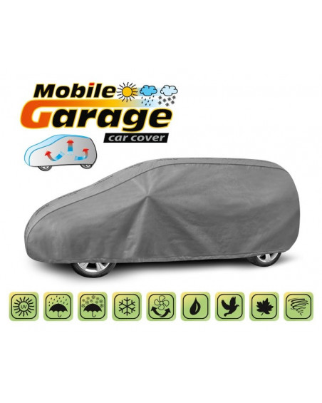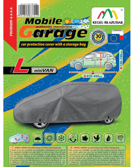 La housse de MOBILE GARAGE de haute qualité est un produit adapté aux besoins des conducteurs. Elle est composée de 4 couches de matériaux épais, solides et durables. La housse protège l'ensemble de la voiture contre les influences néfastes de l'environnement. La housse Mobile Garage est la protection idéale pour votre véhicule tout au long de l'année. Sa fonctionnalité peut être appréciée en toute saison. En hiver, il empêche l'accumulation de neige, de givre et de glace et résiste au gel ; en automne, il protège contre la pluie, le vent, les feuilles, la sève des arbres ; et en été et au printemps, il protège contre les rayons UV, la poussière et les fientes d'oiseaux. Les propriétés particulières du matériau multicouche garantissent que la housse ne se mouille pas, tout en permettant à la vapeur d'eau de s'échapper du dessous de la housse vers l'extérieur. Toute trace d'humidité qui s'accumule sous la bâche s'évapore rapidement, évitant ainsi la rouille de la voiture et la formation de moisissures. La housse convient à une utilisation immédiate ou à long terme. La housse peut être lavée à la main à 40 degrés.