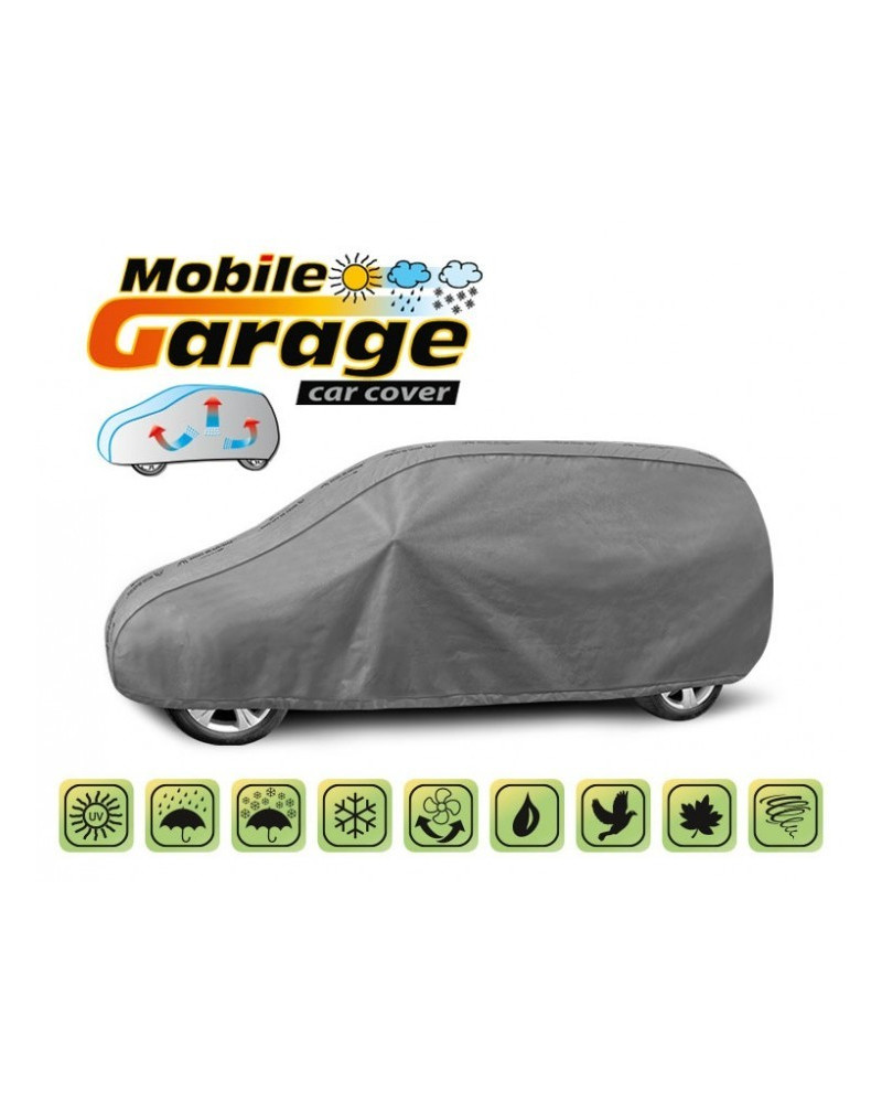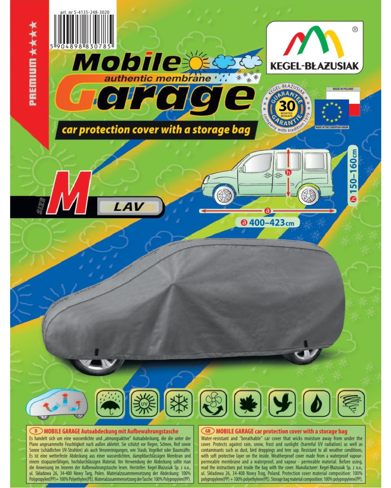 La housse de MOBILE GARAGE de haute qualité est un produit adapté aux besoins des conducteurs. Elle est composée de 4 couches de matériaux épais, solides et durables. La housse protège l'ensemble de la voiture contre les influences néfastes de l'environnement. La housse Mobile Garage est la protection idéale pour votre véhicule tout au long de l'année. Sa fonctionnalité peut être appréciée en toute saison. En hiver, il empêche l'accumulation de neige, de givre et de glace et résiste au gel ; en automne, il protège contre la pluie, le vent, les feuilles, la sève des arbres ; et en été et au printemps, il protège contre les rayons UV, la poussière et les fientes d'oiseaux. Les propriétés particulières du matériau multicouche garantissent que la housse ne se mouille pas, tout en permettant à la vapeur d'eau de s'échapper du dessous de la housse vers l'extérieur. Toute trace d'humidité qui s'accumule sous la bâche s'évapore rapidement, évitant ainsi la rouille de la voiture et la formation de moisissures. La housse convient à une utilisation immédiate ou à long terme. La housse peut être lavée à la main à 40 degrés.