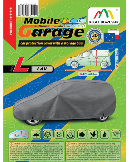 La housse de MOBILE GARAGE de haute qualité est un produit adapté aux besoins des conducteurs. Elle est composée de 4 couches de matériaux épais, solides et durables. La housse protège l'ensemble de la voiture contre les influences néfastes de l'environnement. La housse Mobile Garage est la protection idéale pour votre véhicule tout au long de l'année. Sa fonctionnalité peut être appréciée en toute saison. En hiver, il empêche l'accumulation de neige, de givre et de glace et résiste au gel ; en automne, il protège contre la pluie, le vent, les feuilles, la sève des arbres ; et en été et au printemps, il protège contre les rayons UV, la poussière et les fientes d'oiseaux. Les propriétés particulières du matériau multicouche garantissent que la housse ne se mouille pas, tout en permettant à la vapeur d'eau de s'échapper du dessous de la housse vers l'extérieur. Toute trace d'humidité qui s'accumule sous la bâche s'évapore rapidement, évitant ainsi la rouille de la voiture et la formation de moisissures. La housse convient à une utilisation immédiate ou à long terme. La housse peut être lavée à la main à 40 degrés.
