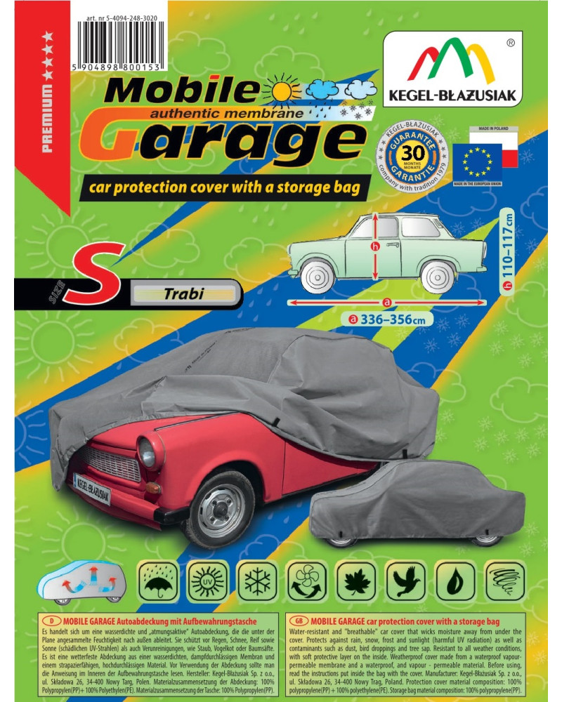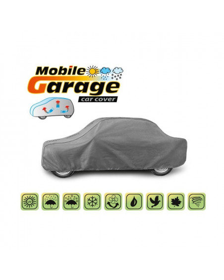 La housse de MOBILE GARAGE de haute qualité est un produit adapté aux besoins des conducteurs. Elle est composée de 4 couches de matériaux épais, solides et durables. La housse protège l'ensemble de la voiture contre les influences néfastes de l'environnement. La housse Mobile Garage est la protection idéale pour votre véhicule tout au long de l'année. Sa fonctionnalité peut être appréciée en toute saison. En hiver, il empêche l'accumulation de neige, de givre et de glace et résiste au gel ; en automne, il protège contre la pluie, le vent, les feuilles, la sève des arbres ; et en été et au printemps, il protège contre les rayons UV, la poussière et les fientes d'oiseaux. Les propriétés particulières du matériau multicouche garantissent que la housse ne se mouille pas, tout en permettant à la vapeur d'eau de s'échapper du dessous de la housse vers l'extérieur. Toute trace d'humidité qui s'accumule sous la bâche s'évapore rapidement, évitant ainsi la rouille de la voiture et la formation de moisissures. La housse convient à une utilisation immédiate ou à long terme. La housse peut être lavée à la main à 40 degrés.