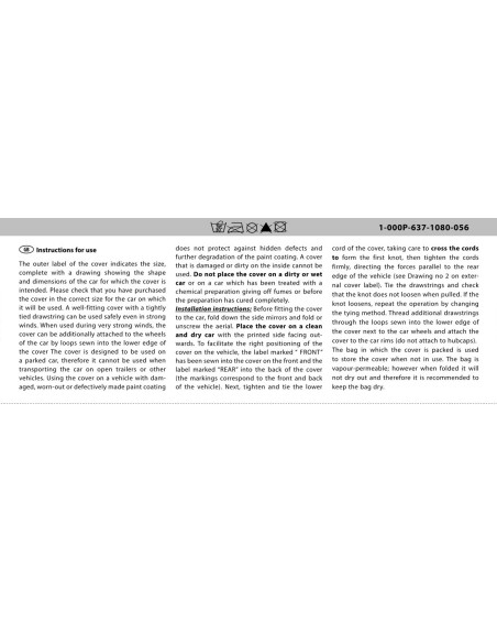 ATTENTION : la housse souillée à l'intérieur ne doit pas être utilisée. La housse doit être utilisée uniquement sur la voiture garée - elle ne peut pas être utilisée lors du transport de la voiture sur une remorque.
