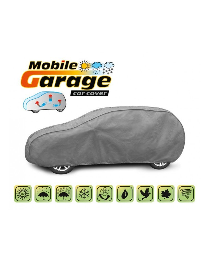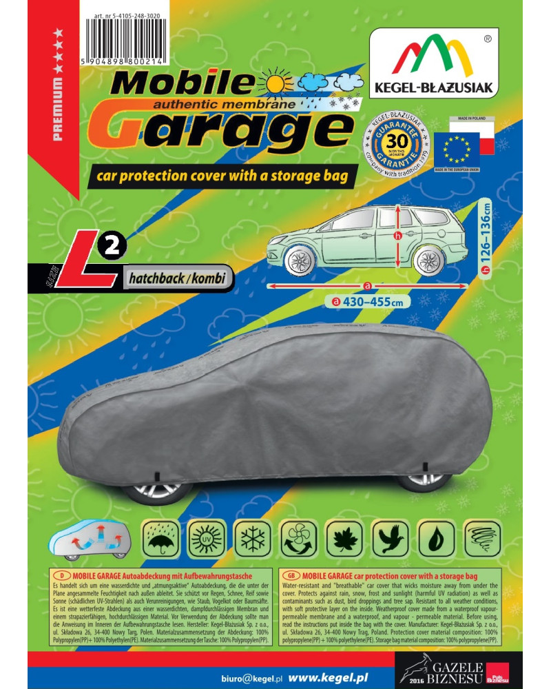 La housse de MOBILE GARAGE de haute qualité est un produit adapté aux besoins des conducteurs. Elle est composée de 4 couches de matériaux épais, solides et durables. La housse protège l'ensemble de la voiture contre les influences néfastes de l'environnement. La housse Mobile Garage est la protection idéale pour votre véhicule tout au long de l'année. Sa fonctionnalité peut être appréciée en toute saison. En hiver, il empêche l'accumulation de neige, de givre et de glace et résiste au gel ; en automne, il protège contre la pluie, le vent, les feuilles, la sève des arbres ; et en été et au printemps, il protège contre les rayons UV, la poussière et les fientes d'oiseaux. Les propriétés particulières du matériau multicouche garantissent que la housse ne se mouille pas, tout en permettant à la vapeur d'eau de s'échapper du dessous de la housse vers l'extérieur. Toute trace d'humidité qui s'accumule sous la bâche s'évapore rapidement, évitant ainsi la rouille de la voiture et la formation de moisissures. La housse convient à une utilisation immédiate ou à long terme. La housse peut être lavée à la main à 40 degrés.
