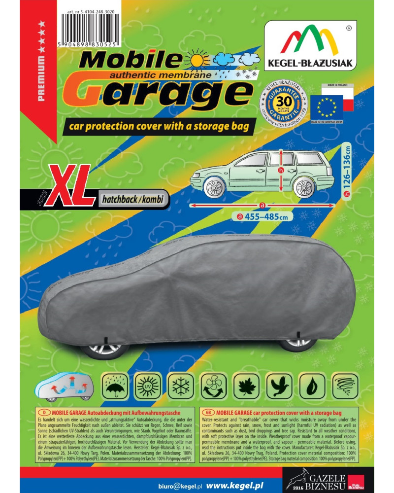 La housse de MOBILE GARAGE de haute qualité est un produit adapté aux besoins des conducteurs. Elle est composée de 4 couches de matériaux épais, solides et durables. La housse protège l'ensemble de la voiture contre les influences néfastes de l'environnement. La housse Mobile Garage est la protection idéale pour votre véhicule tout au long de l'année. Sa fonctionnalité peut être appréciée en toute saison. En hiver, il empêche l'accumulation de neige, de givre et de glace et résiste au gel ; en automne, il protège contre la pluie, le vent, les feuilles, la sève des arbres ; et en été et au printemps, il protège contre les rayons UV, la poussière et les fientes d'oiseaux. Les propriétés particulières du matériau multicouche garantissent que la housse ne se mouille pas, tout en permettant à la vapeur d'eau de s'échapper du dessous de la housse vers l'extérieur. Toute trace d'humidité qui s'accumule sous la bâche s'évapore rapidement, évitant ainsi la rouille de la voiture et la formation de moisissures. La housse convient à une utilisation immédiate ou à long terme. La housse peut être lavée à la main à 40 degrés.