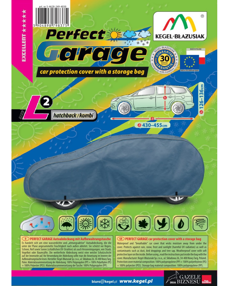 La housse PERFECT GARAGE de haute qualité - imperméable à l'eau et perméable à la vapeur. Fabriquée en Pologne, principalement à partir de matières premières polonaises, avec toutes les normes de qualité de l'Union européenne. Des années d'expérience et une gamme de produits de plus en plus excellente font que les housses de la société KEGEL-BŁAŻUSIAK peuvent être décrites comme les meilleures en Pologne. Un produit de la série PERFECT GARAGE, dont la devise est - très bonne qualité.