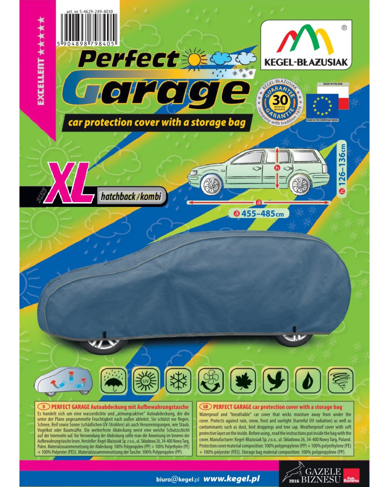 La housse PERFECT GARAGE de haute qualité - imperméable à l'eau et perméable à la vapeur. Fabriquée en Pologne, principalement à partir de matières premières polonaises, avec toutes les normes de qualité de l'Union européenne. Des années d'expérience et une gamme de produits de plus en plus excellente font que les housses de la société KEGEL-BŁAŻUSIAK peuvent être décrites comme les meilleures en Pologne. Un produit de la série PERFECT GARAGE, dont la devise est - très bonne qualité.